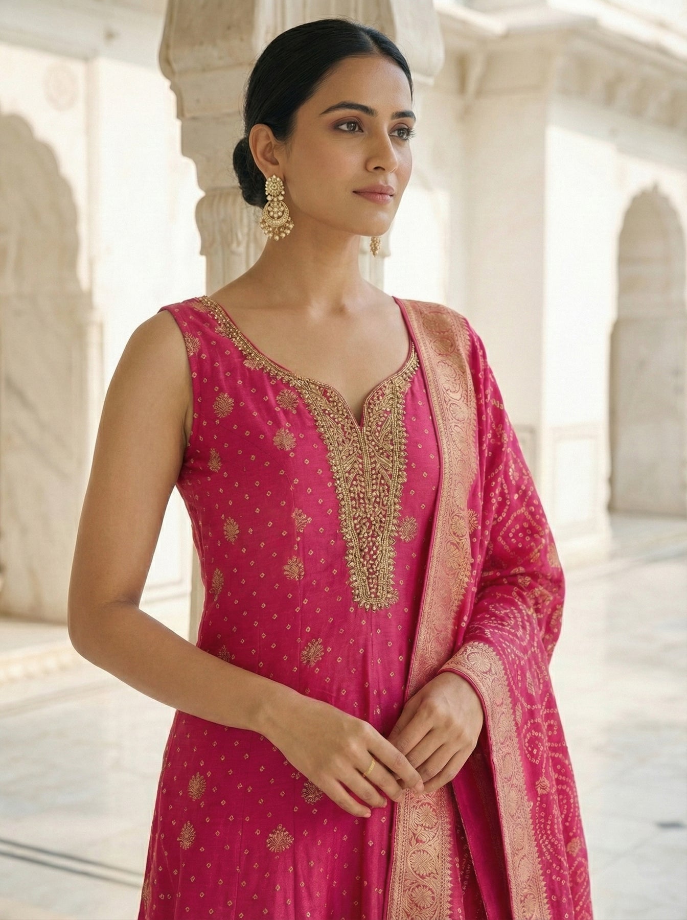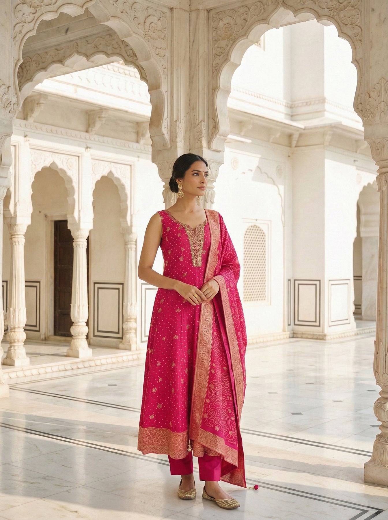 Elevate your ethnic wardrobe with this exquisite three-piece ensemble in luxurious rani pink silk. Adorned with intricate floral motifs and shimmering zari embroidery, each piece showcases masterful craftsmanship and timeless elegance. The rich color palette and detailed embellishments make this set perfect for weddings, festive celebrations, and special occasions. Crafted from premium silk fabric, it offers both comfort and a refined aesthetic that complements traditional and contemporary styling. A versatile investment piece that brings sophistication to your collection.