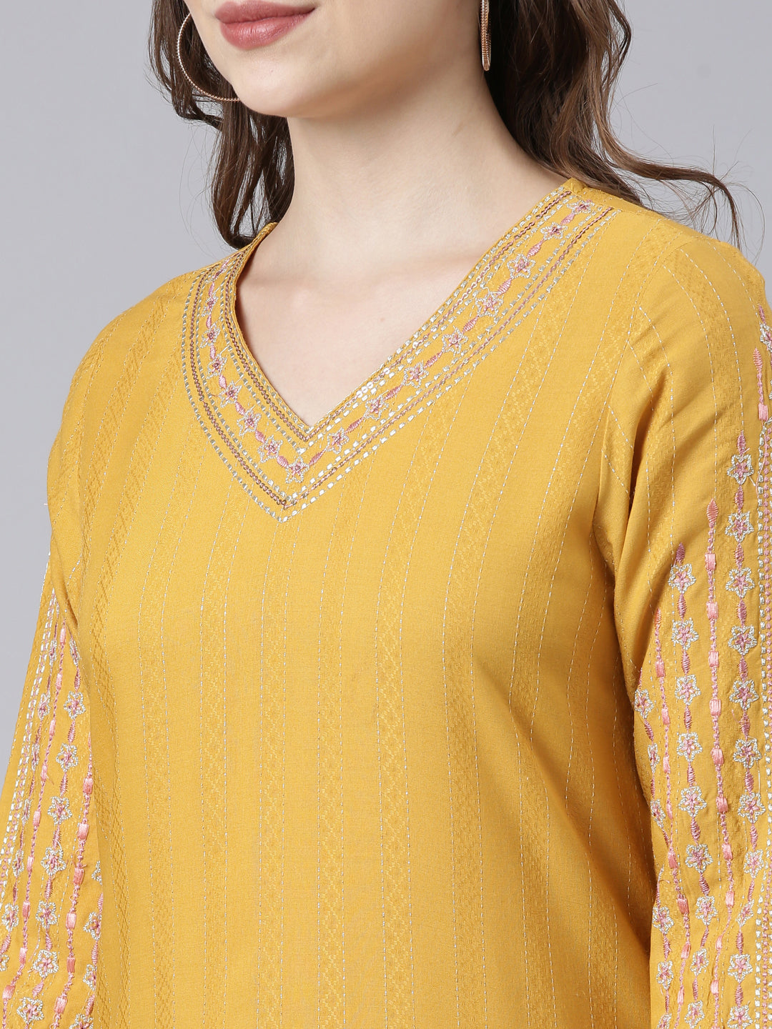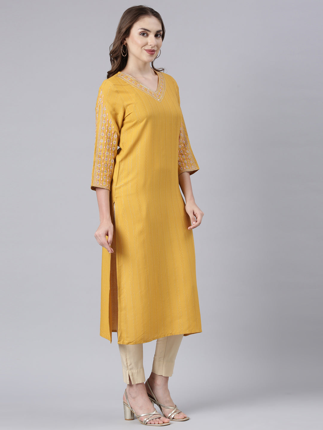 Introducing the Neerus Mustard Panelled Straight Floral Kurtas. A beautiful addition to your wardrobe, these kurtas are designed with a floral pattern and a unique panelled straight cut for a flattering fit. Perfect for a simple yet stylish look.
