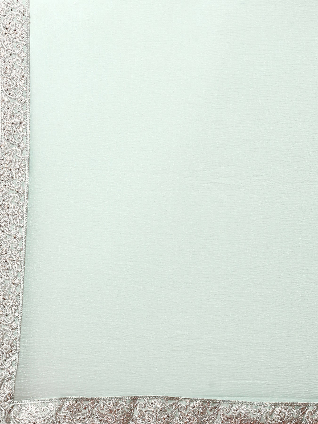 Elevate your wardrobe with this aqua green three-piece palazzo set, featuring intricate hand embroidery that showcases exquisite craftsmanship. The flowing palazzo pants offer comfort and elegance, perfectly complemented by a matching embroidered top and coordinating dupatta. Ideal for festive occasions or sophisticated gatherings, this set combines traditional artistry with contemporary style for a refined, graceful look.