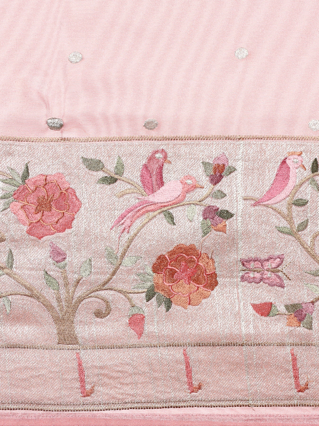 Elevate your elegance with this baby pink Banaras silk saree, adorned with intricate Meena work on the border and delicate motifs throughout. Crafted from rich silk, it offers a timeless appeal ideal for special occasions. The subtle pink hue combined with detailed craftsmanship creates a graceful and refined look, perfect for those who appreciate classic sophistication.