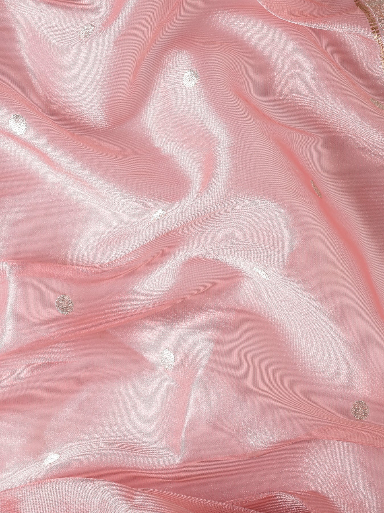 This baby pink Banarasi silk saree features exquisite Meena work on its border and motifs, showcasing traditional craftsmanship with a delicate and vibrant touch. The luxurious silk fabric offers a soft drape and subtle sheen, making it ideal for special occasions. Its intricate Meena detailing enhances the saree’s elegance, blending heritage artistry with contemporary appeal. Perfect for those seeking timeless grace with refined embellishments.