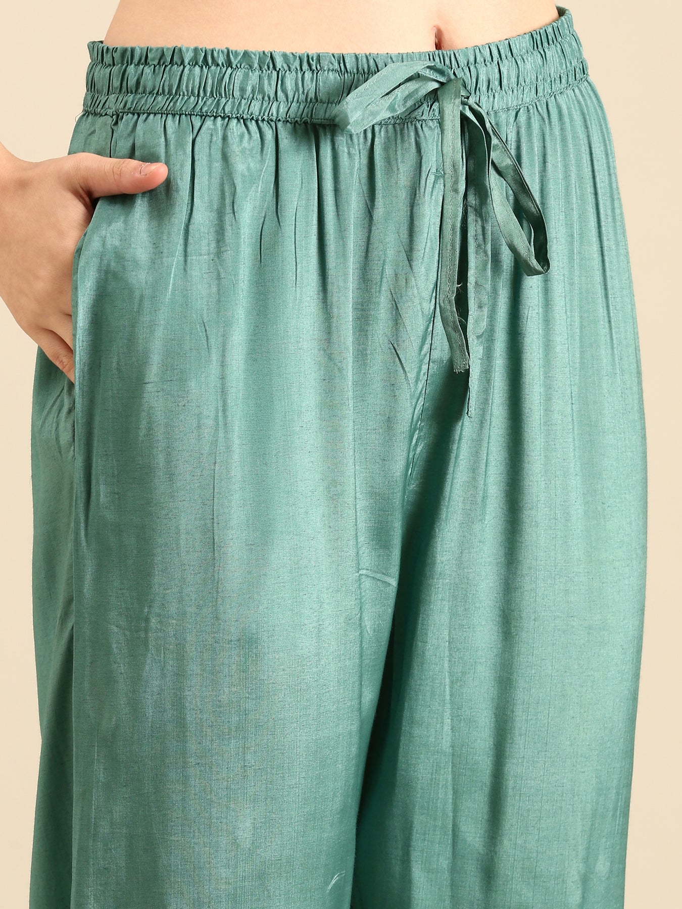 Elevate your wardrobe with this stunning beige block printed suit set paired with a matching dupatta. Crafted from breathable modal silk, it features an all-over teal blue print that adds a vibrant touch. The elegant V-neck is beautifully enhanced with intricate big mirror work, making it perfect for festive occasions or special gatherings. Experience a blend of comfort and style that effortlessly boosts your confidence wherever you go.