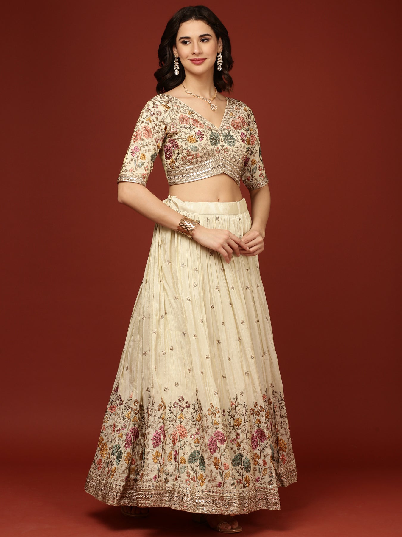 Elevate your traditional wardrobe with this Beige Silk Ghagra Set adorned with delicate floral motifs. Crafted from luxurious silk, it offers a graceful drape and a refined sheen, perfect for festive occasions or weddings. The subtle beige color combined with intricate floral detailing exudes timeless elegance, making it a versatile choice for those who appreciate classic sophistication. Comfortable yet stylish, this set promises to enhance your presence with understated charm.