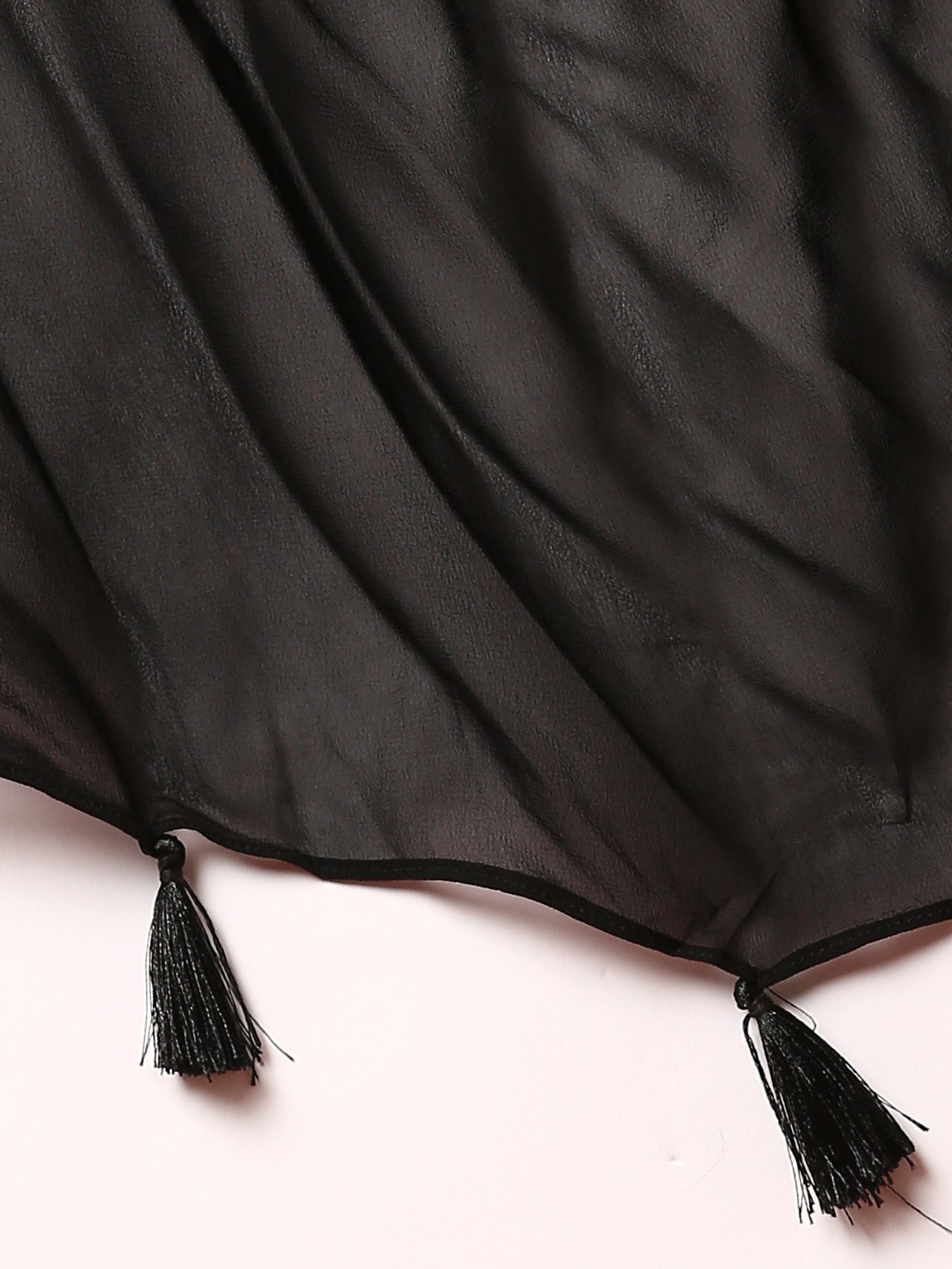 This elegant black peplum top, richly hand embroidered, pairs beautifully with a matching palazzo set, creating a graceful ensemble for any special occasion. The detailed craftsmanship adds a touch of sophistication, while the comfortable fit ensures ease of wear throughout your day. Perfect for making a stylish statement with confidence and comfort.