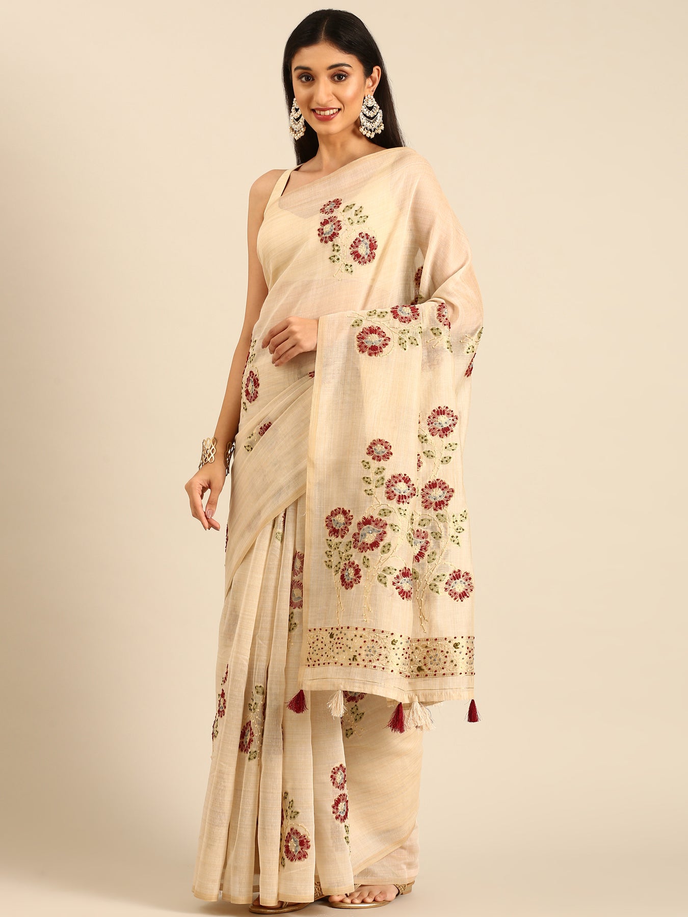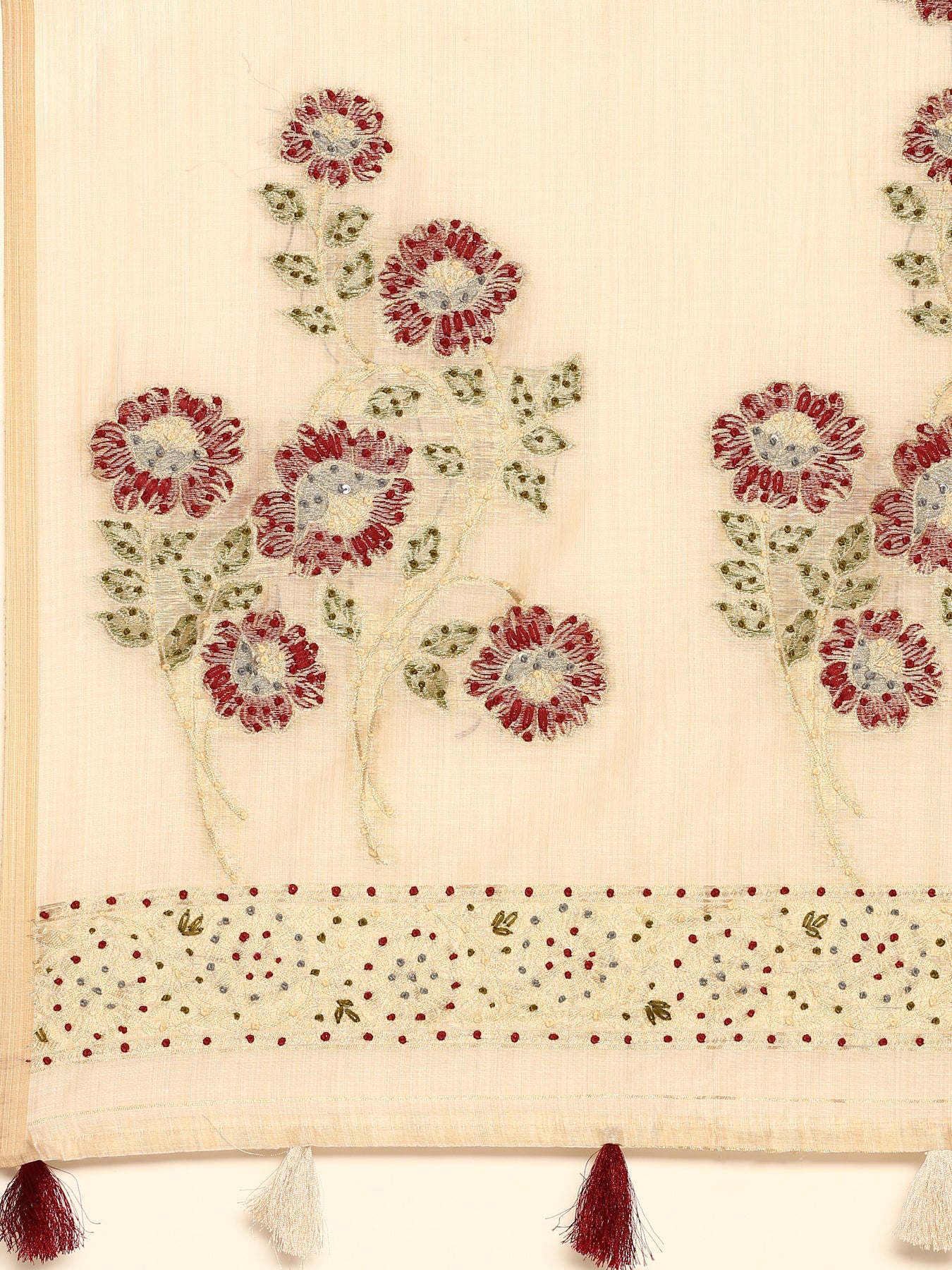 Crafted from luxurious cream Chanderi silk, this piece showcases exquisite French knot contrast thread work embellished with delicate sequins. The intricate detailing enhances the fabric's natural sheen, offering a refined and elegant look ideal for special occasions. The combination of traditional craftsmanship and subtle sparkle ensures a timeless appeal with sophisticated texture and depth.
