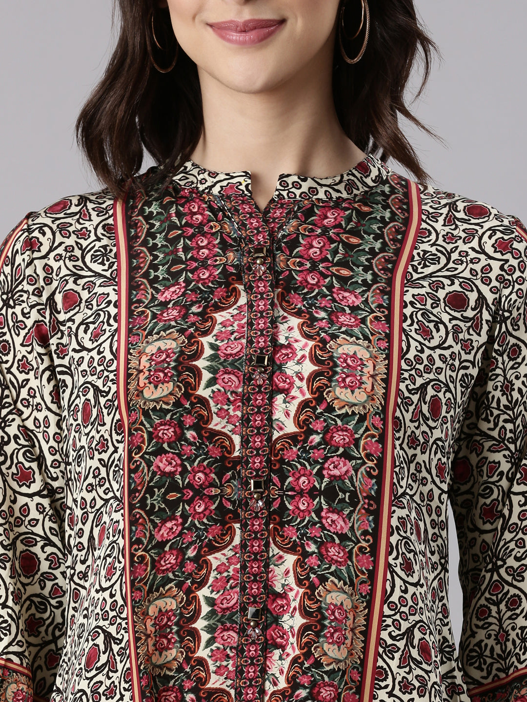 This cream crepe top features an elegant Kalamkari print, combining traditional artistry with contemporary style. The lightweight crepe fabric ensures a comfortable drape while adding a refined texture. Perfect for sophisticated daywear, this top pairs effortlessly with tailored pants or skirts, creating a graceful and polished look.