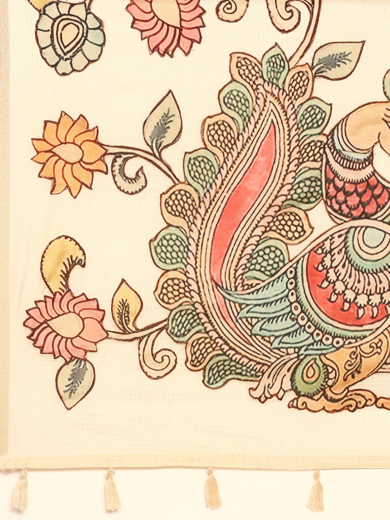 Experience elegance with this cream kota saree featuring intricate kalamkari appliqué work on the pallu. Its lightweight, breathable fabric ensures comfort throughout the day, while the detailed artistry adds a touch of traditional charm. Perfect for festive occasions or casual gatherings, this saree beautifully combines style and comfort to enhance your graceful presence.