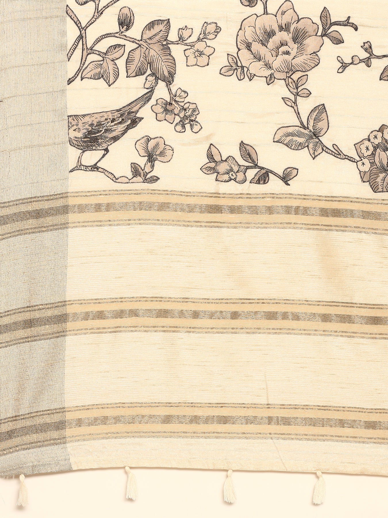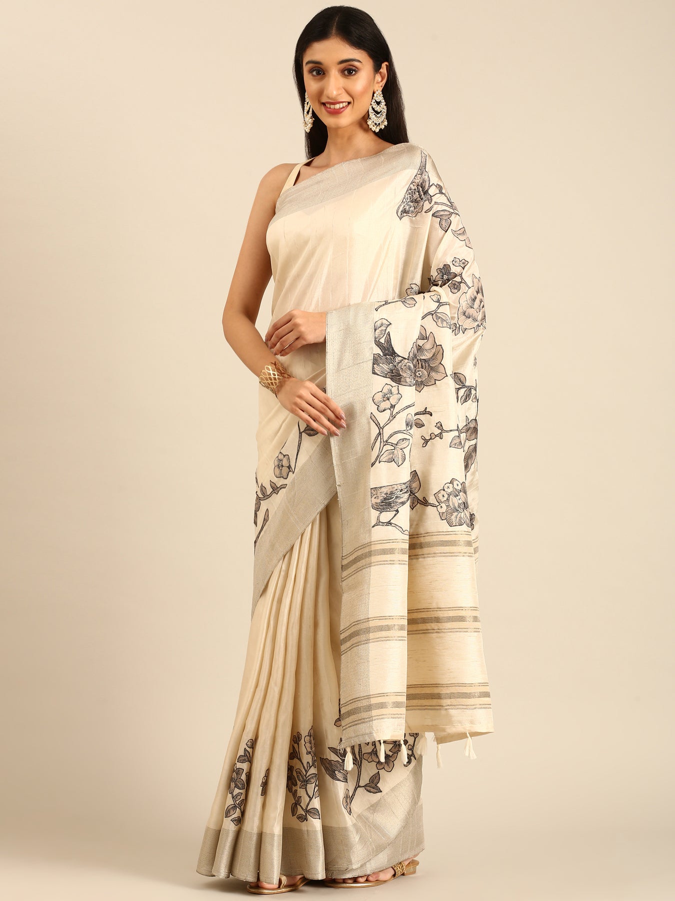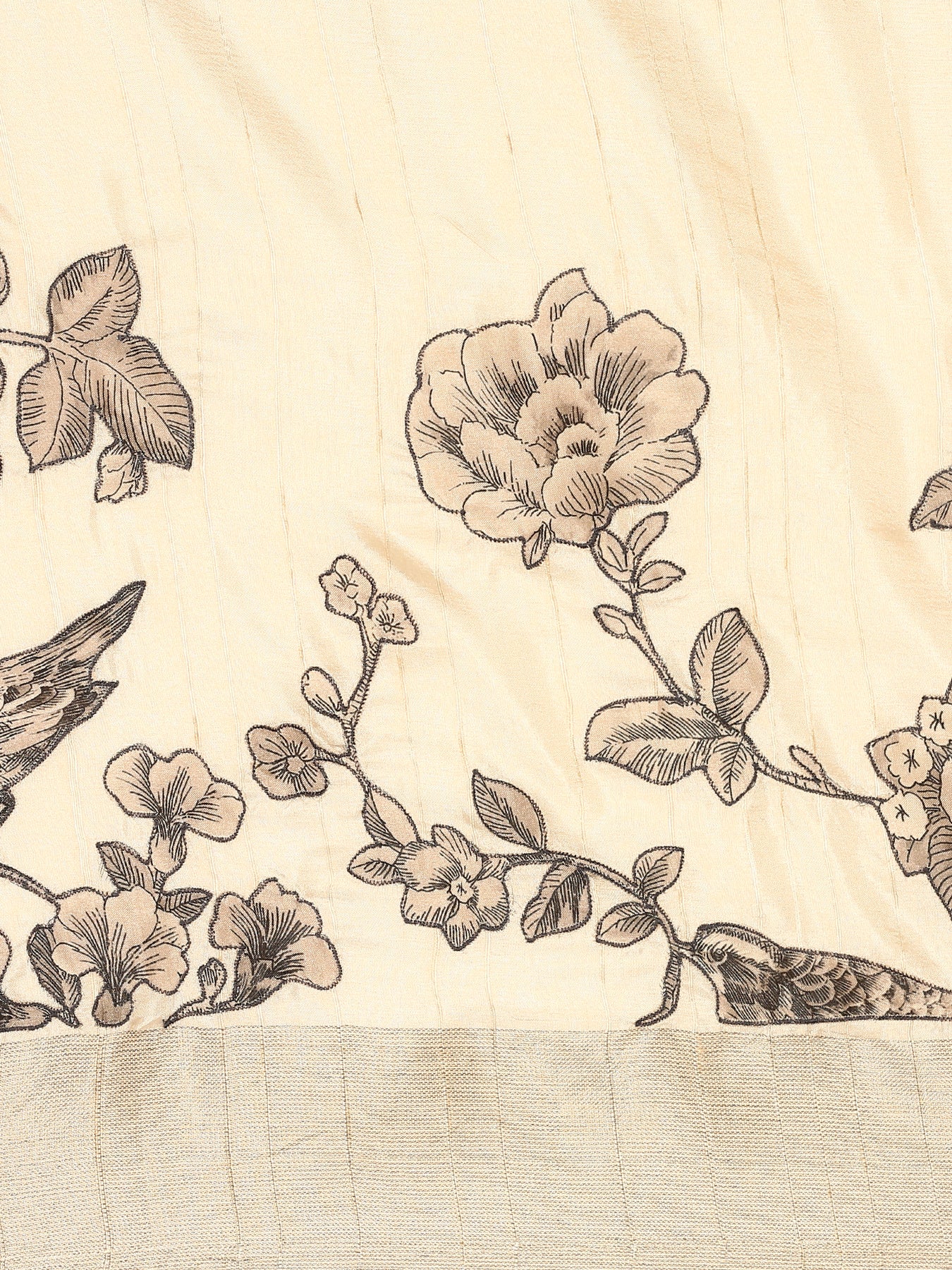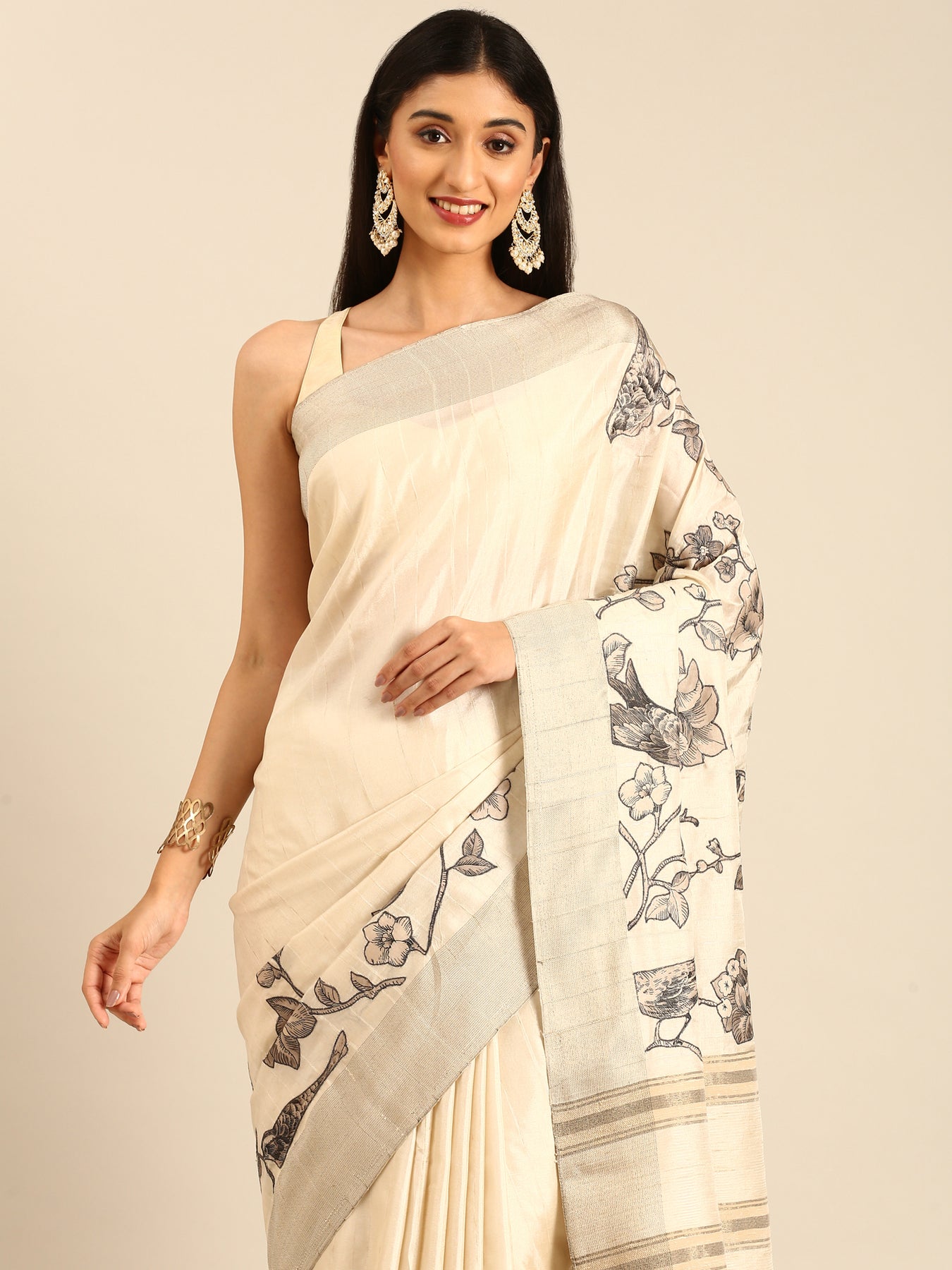 Elevate your elegance with this Cream Natural Dupion Saree, adorned with delicate floral prints. Crafted from premium dupion fabric, it offers a rich texture and graceful drape, making it perfect for both formal occasions and festive gatherings. The subtle cream hue complements the intricate floral design, providing a timeless and refined look that enhances your sophistication effortlessly.