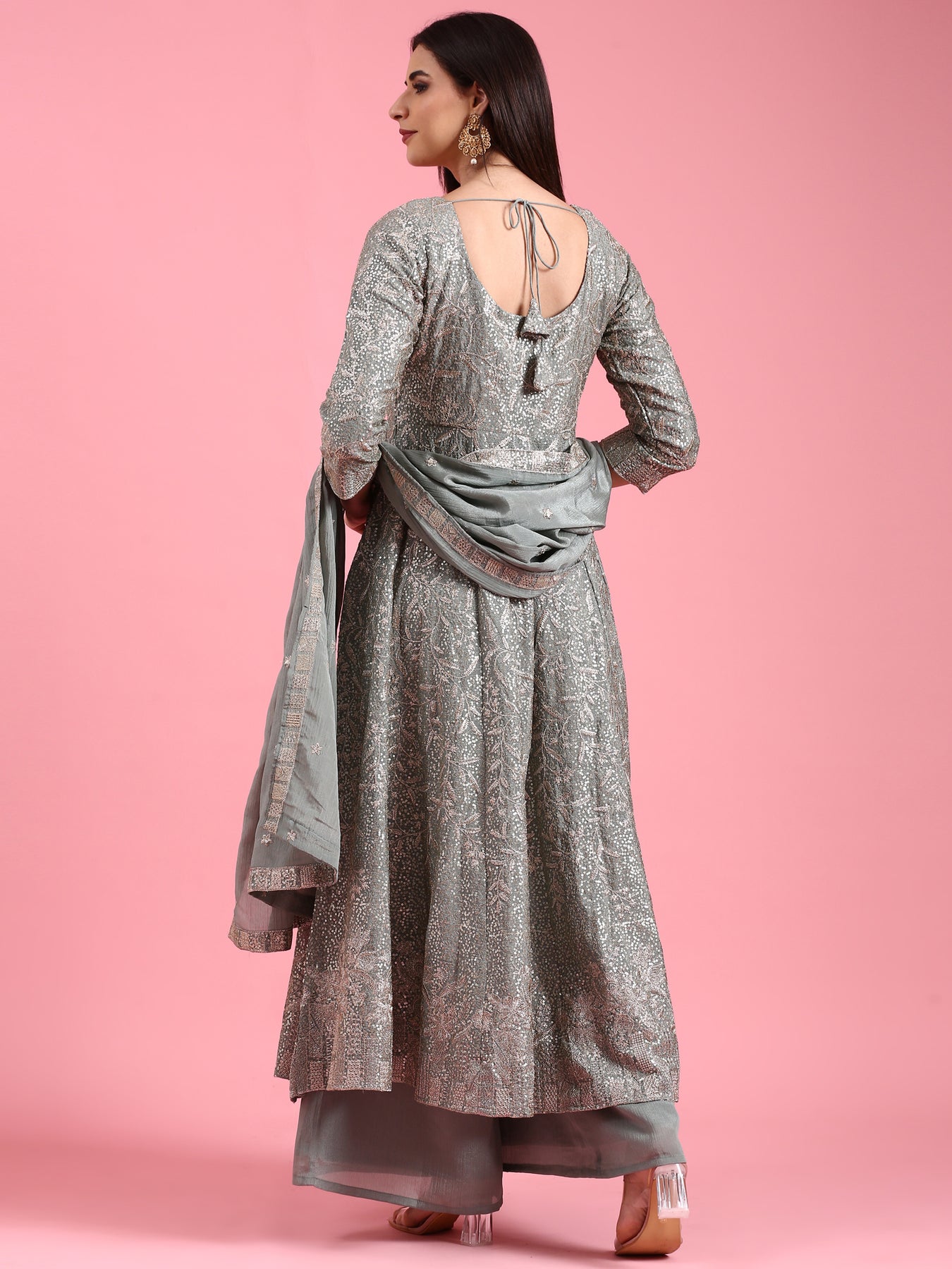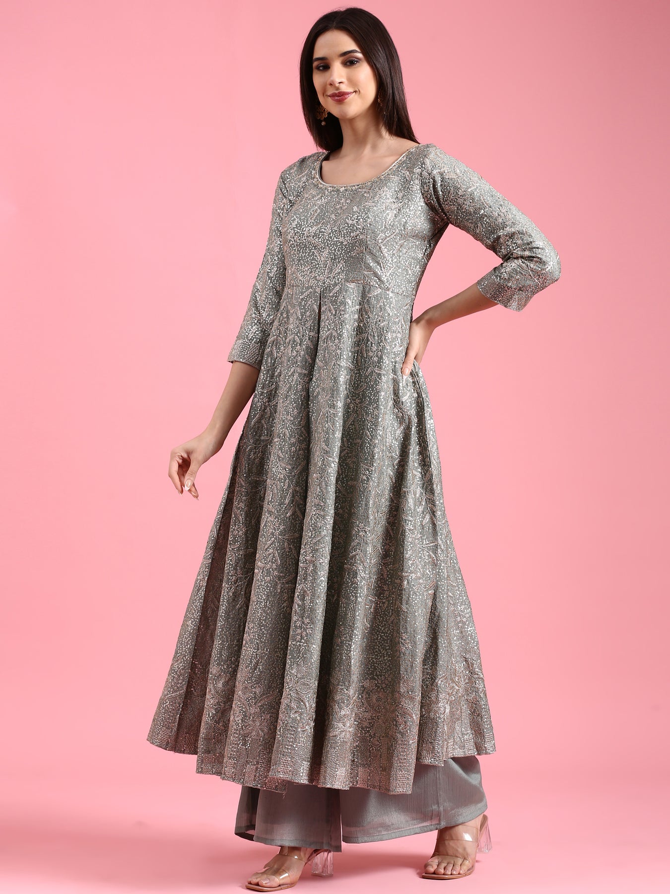 Elevate your ethnic wardrobe with this Green Chinon Heavy Embroidered Kali paired with matching Palazzo pants. Crafted from luxurious Chinon fabric, the ensemble features intricate embroidery that adds depth and elegance. The flowing Kali complements the wide-legged Palazzo for a graceful silhouette, perfect for special occasions or festive gatherings. Experience timeless style combined with comfort in this sophisticated set.