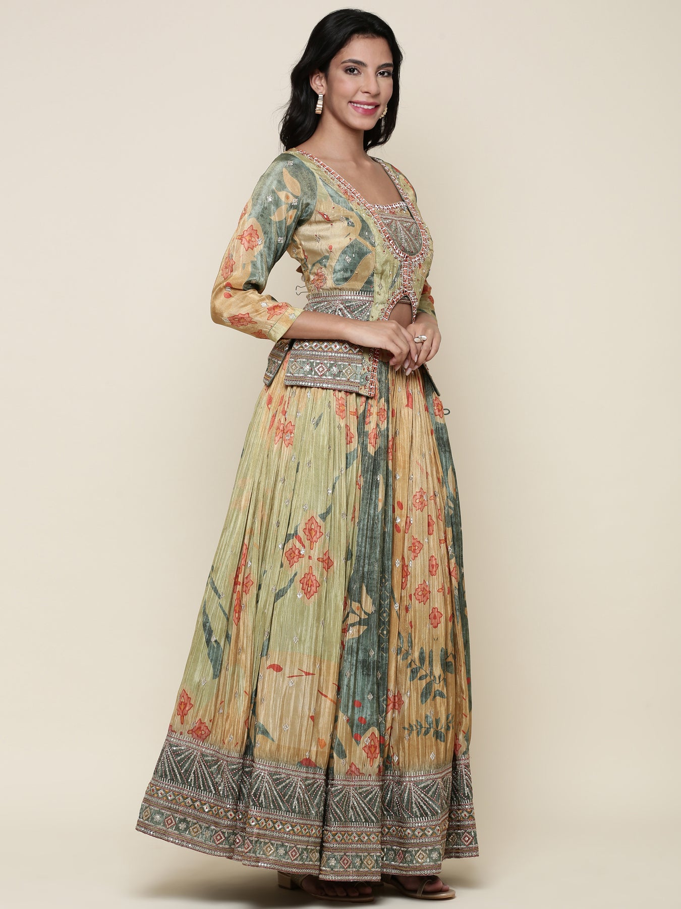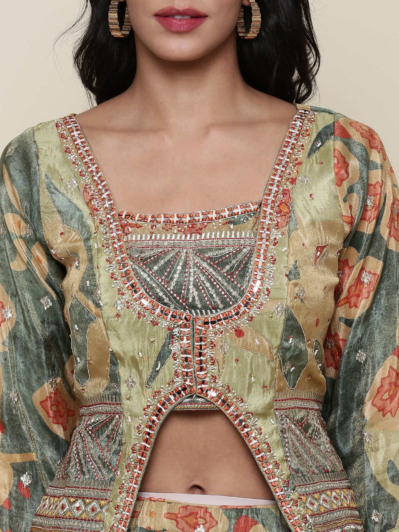 Green tissue embroidered jacket ghagra set