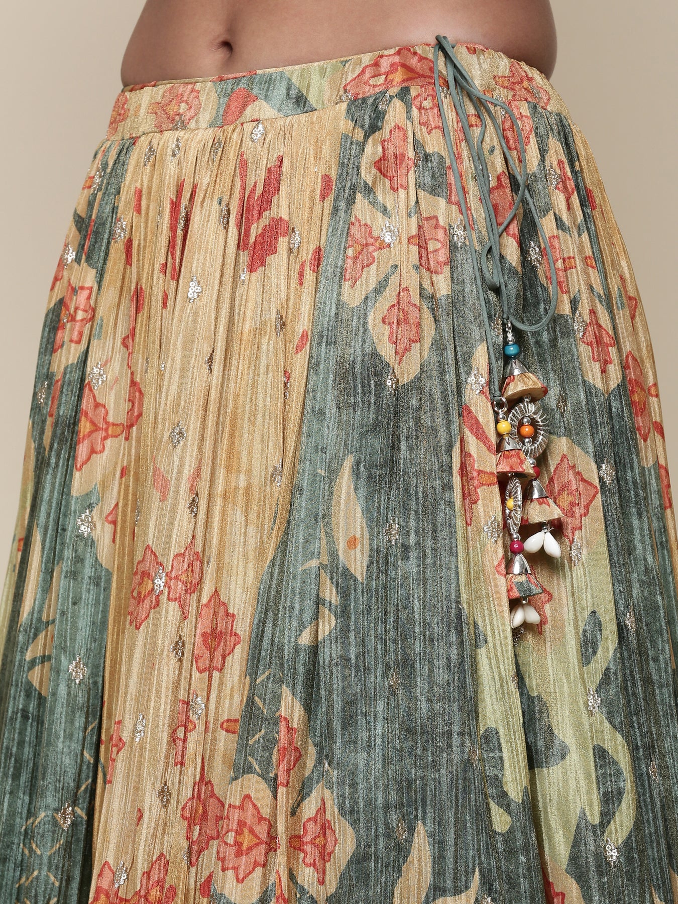 Elevate your festive wardrobe with this stunning green tissue embroidered two-piece ghagra set. The intricately embroidered jacket adds elegance and charm, perfectly complementing the flowing ghagra for a graceful silhouette. Lightweight and vibrant, this set ensures you stand out effortlessly at any celebration or special occasion. Experience the perfect blend of traditional craftsmanship and contemporary style in one exquisite ensemble.