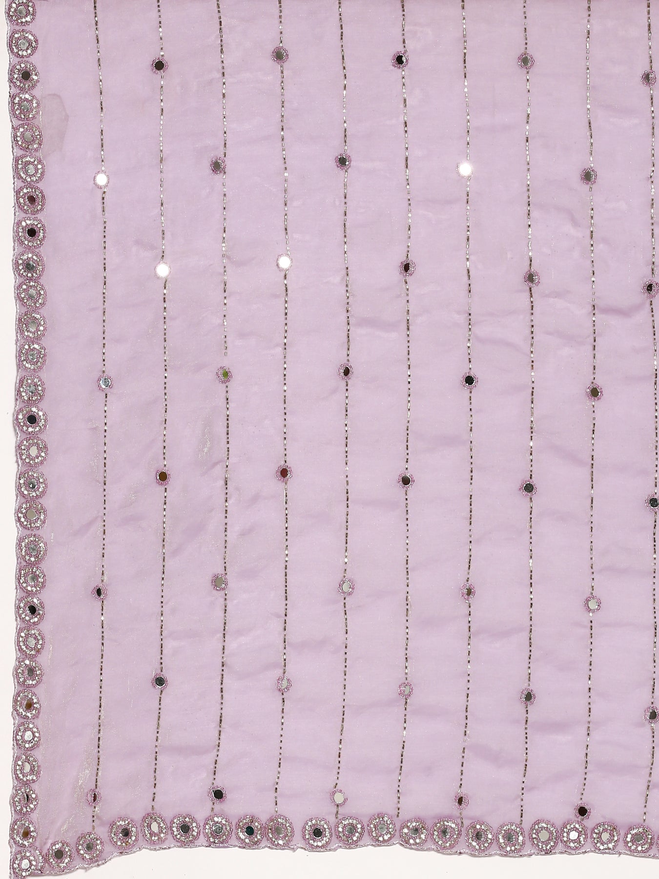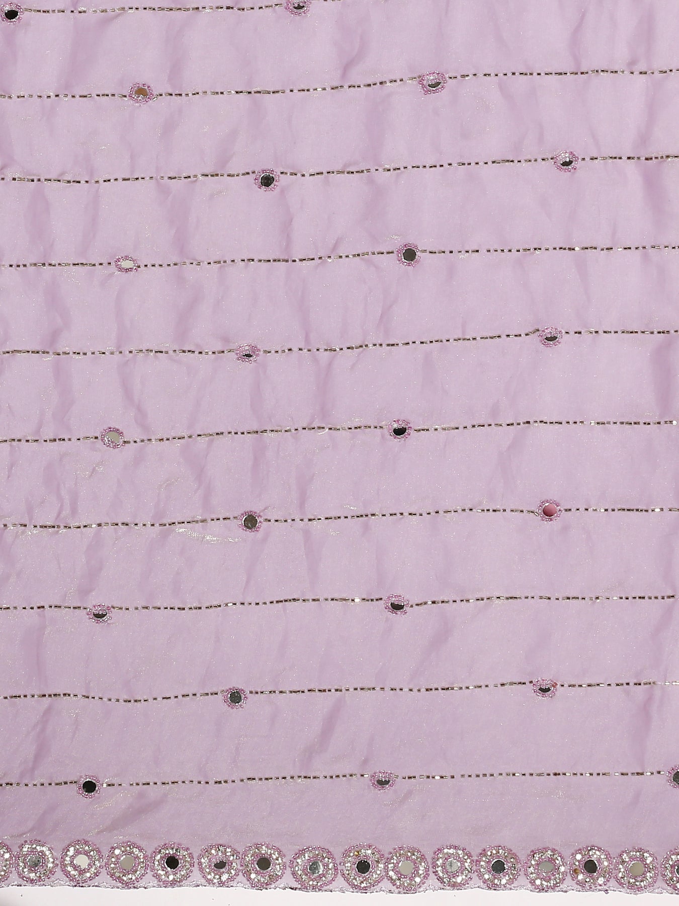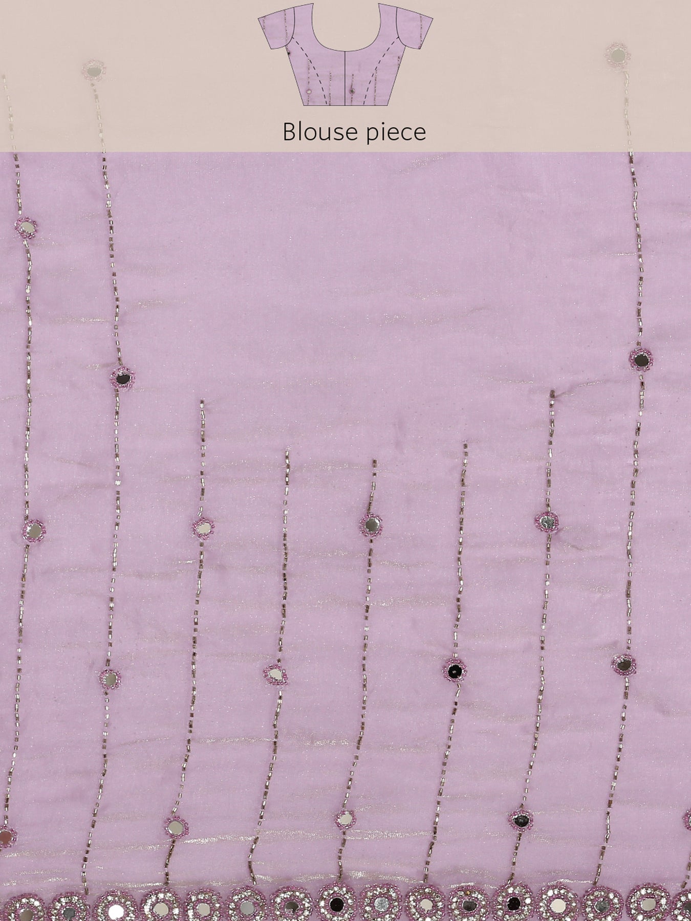 Elevate your elegance with this Lilac Jimmy tissue saree, adorned with exquisite mirror work hand embroidery. The delicate craftsmanship highlights the saree's subtle sheen, offering a timeless blend of tradition and refinement. Perfect for special occasions, it enhances your grace with a sophisticated touch.