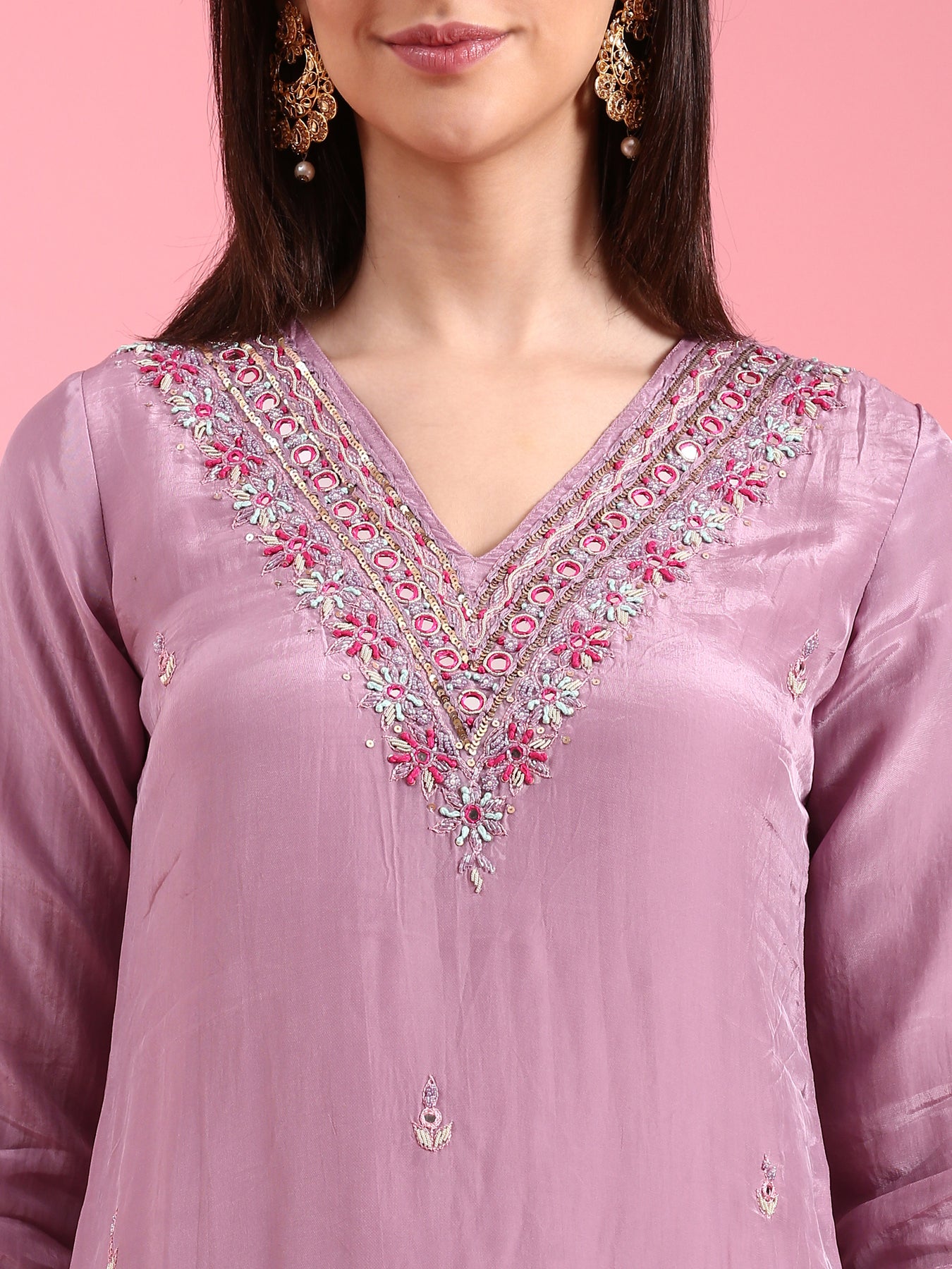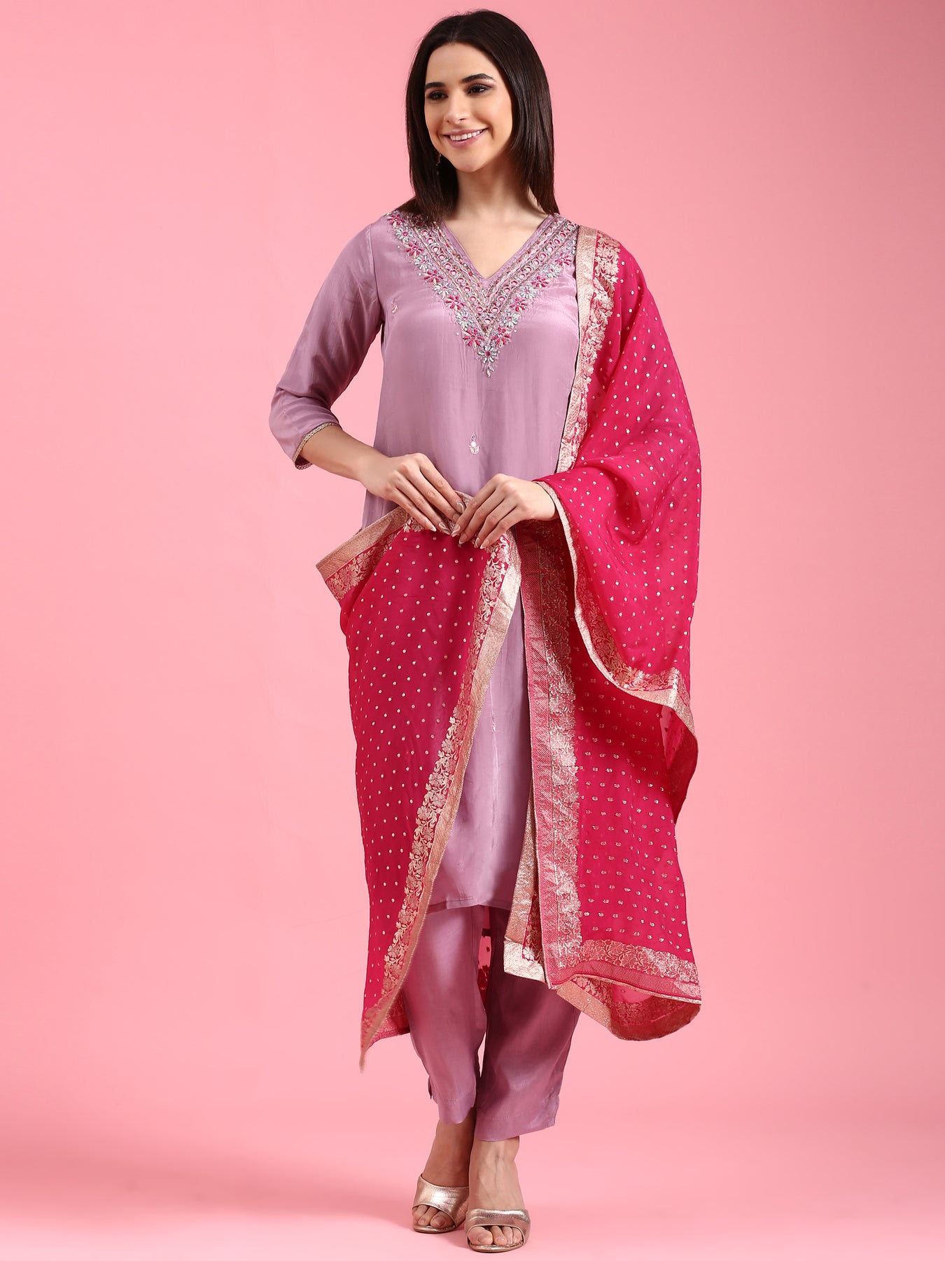 This Lilac Organza Hand Embroidery Three Piece Suit Set blends elegance with intricate craftsmanship. The delicate organza fabric offers a lightweight and graceful drape, while the detailed hand embroidery adds a touch of timeless sophistication. Complete with a matching dupatta and comfortable bottom, this set is perfect for festive occasions and special events, helping you stand out effortlessly with its refined charm. Elevate your wardrobe with