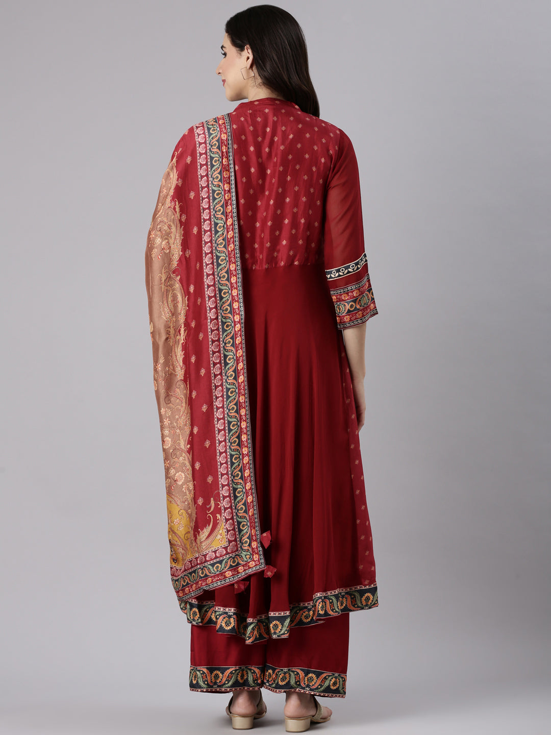Elevate your ethnic wardrobe with this Maroon Georgette Anarkali Three Piece Set. Crafted from flowing georgette fabric, it features a gracefully flared silhouette that enhances your elegance. The rich maroon hue adds a timeless charm, perfect for festive occasions or celebrations. This set combines comfort and style, ensuring you look refined while feeling at ease throughout your day or evening.