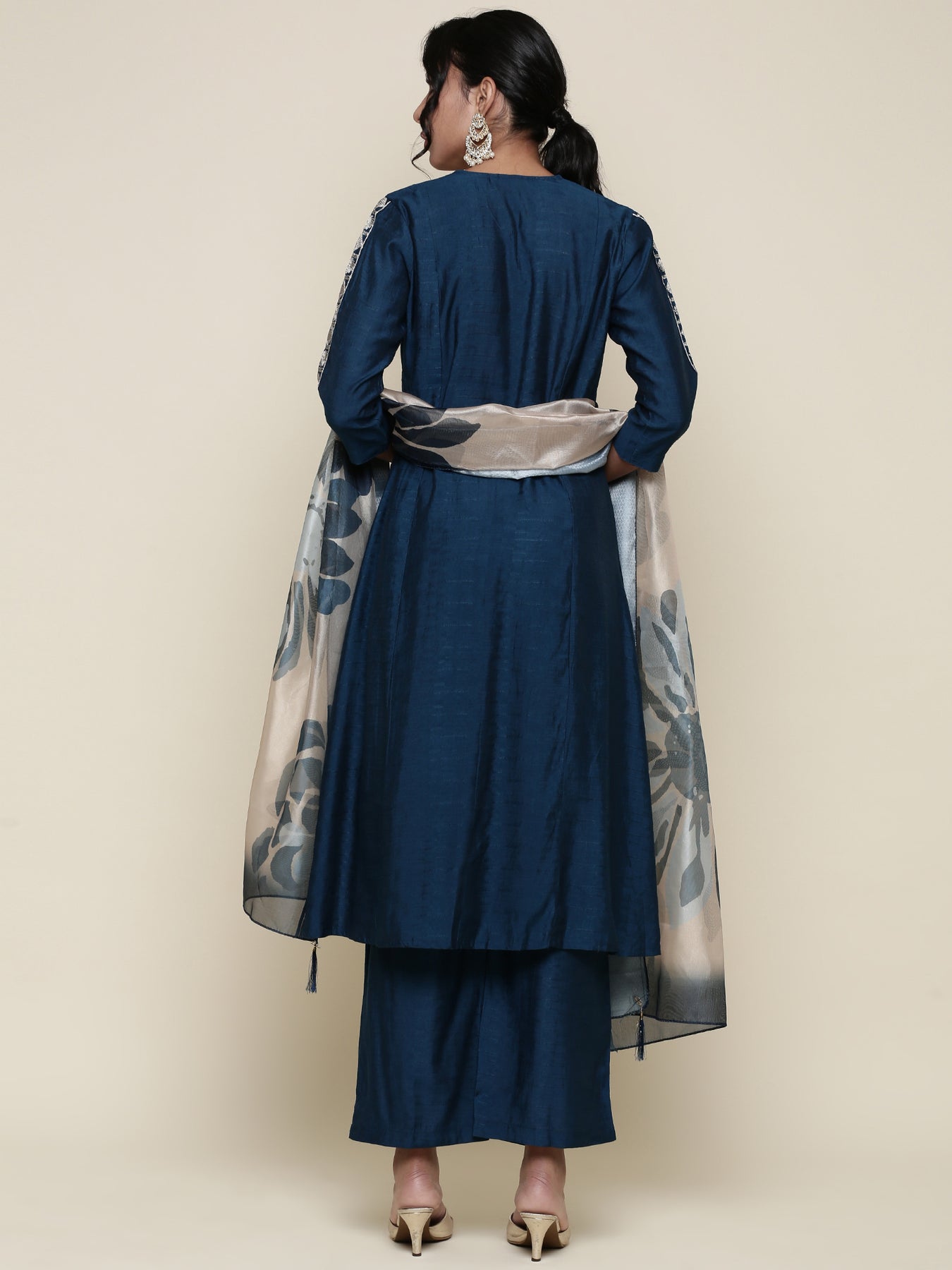 The Muslin Midnight Blue Embroidered Three-Piece Suit Set exudes understated elegance with its lightweight muslin fabric and detailed embroidery. This ensemble includes a thoughtfully designed kurta, coordinating trousers, and a matching dupatta, providing a harmonious and polished look. Ideal for formal occasions, it combines comfort with refined craftsmanship for a timeless appeal.