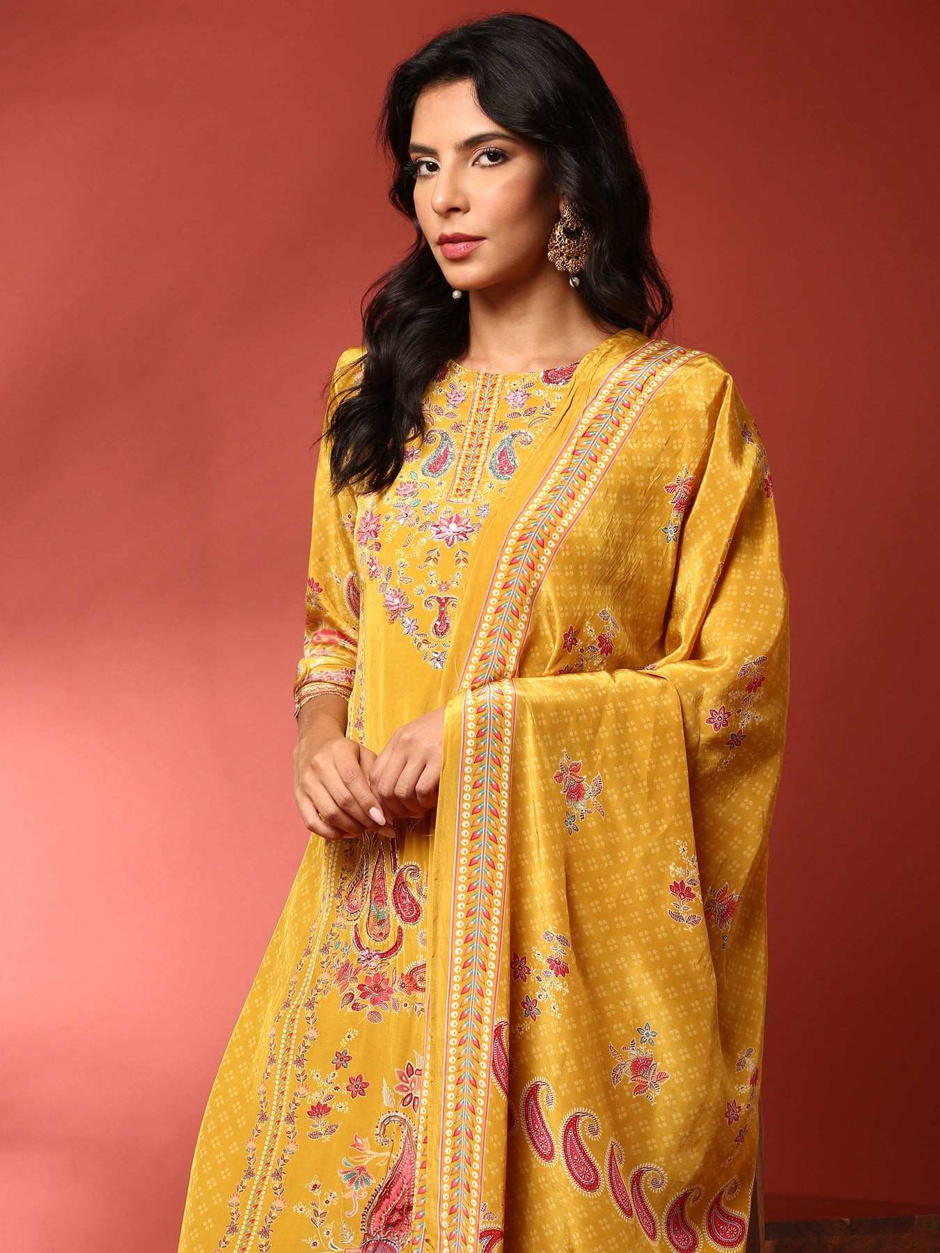 This mustard crepe suit set features intricate embroidery paired with detailed digital prints, offering a sophisticated blend of traditional craftsmanship and modern design. Comprising three pieces, it provides versatility and a cohesive aesthetic perfect for formal occasions. The breathable crepe fabric ensures comfort.