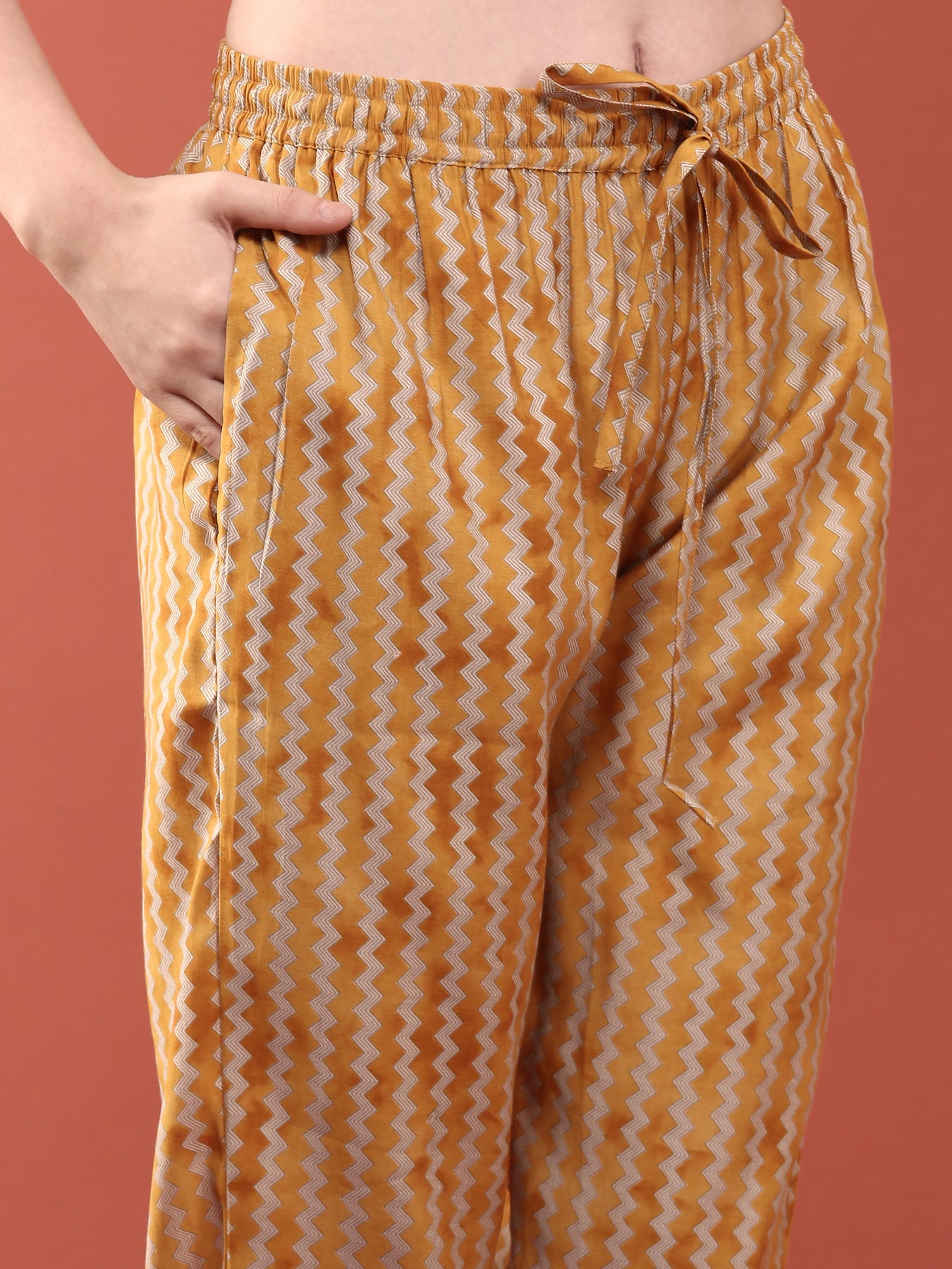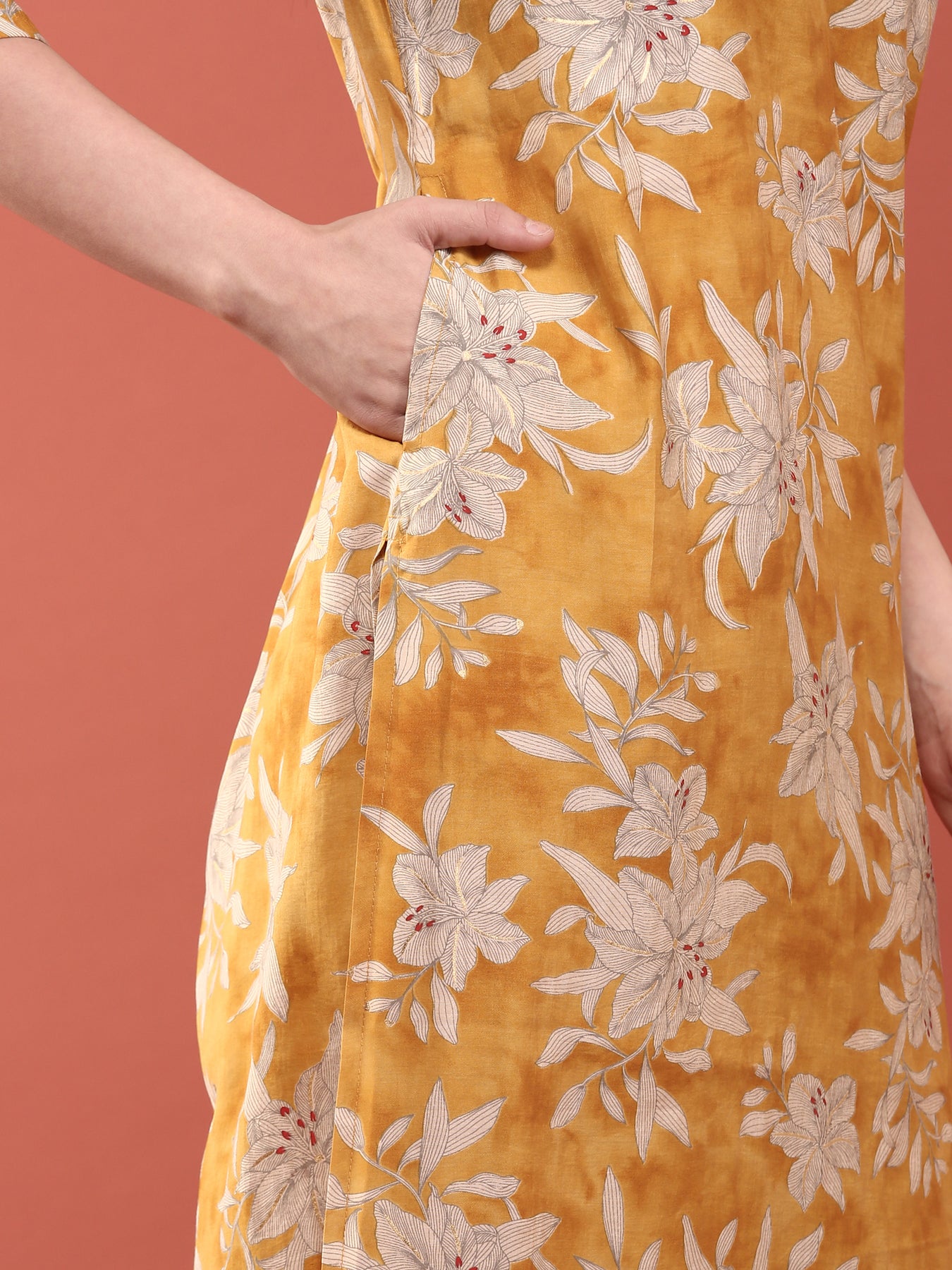 Elevate your ethnic wardrobe with this sophisticated three-piece ensemble crafted from premium dola silk. The mustard base provides a warm, versatile canvas that complements all skin tones, while the intricate floral digital print adds contemporary elegance to traditional styling. Dola silk's natural lustre and fluid drape create a refined silhouette, making this set ideal for festive occasions, celebrations, and formal gatherings.