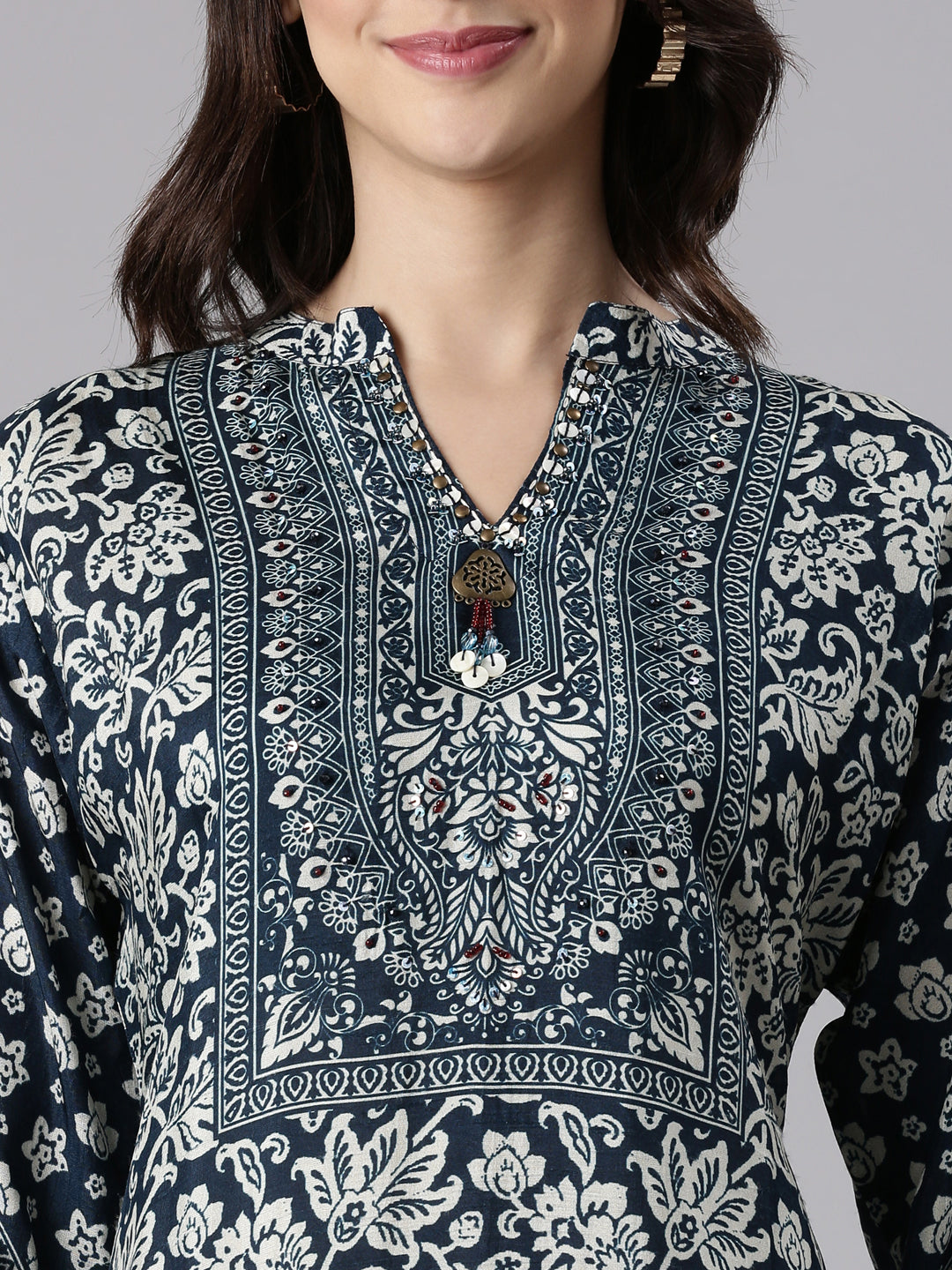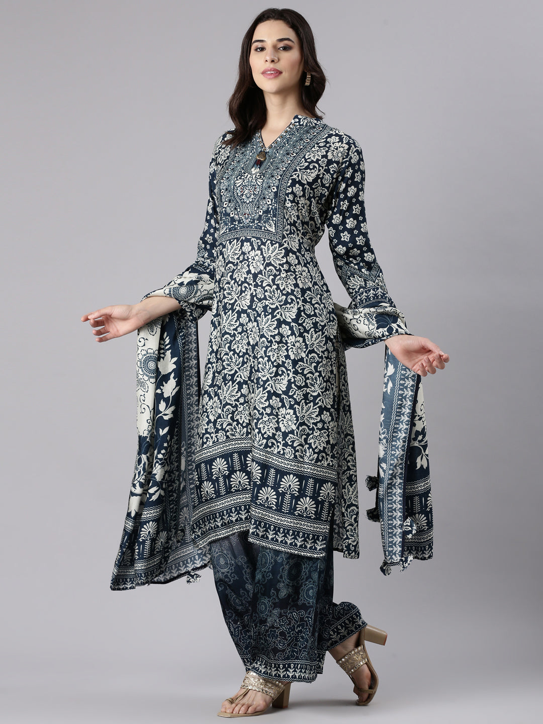 Navy Blue Muslin Printed A-Line Three Piece Set