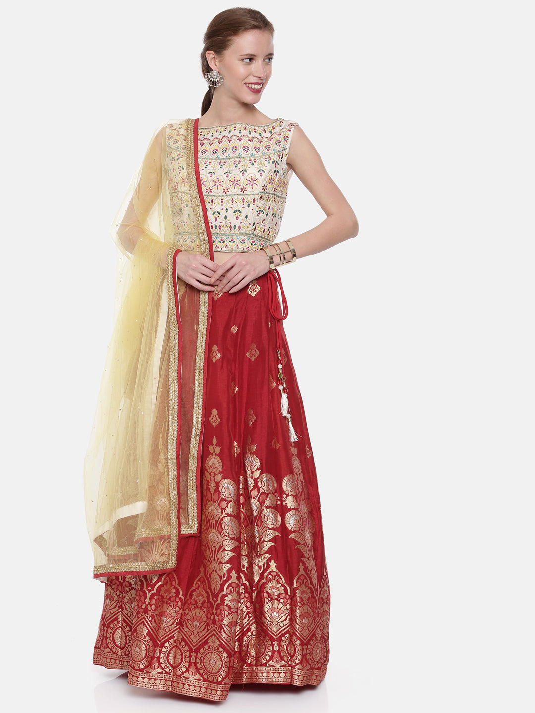 Neerus Beige & Maroon Embroidered Lehenga Set