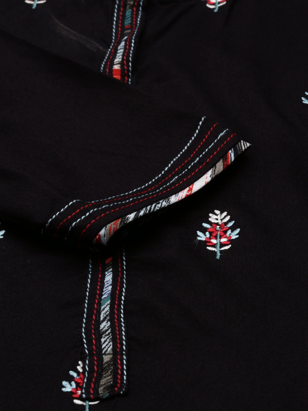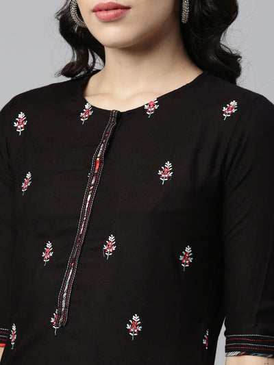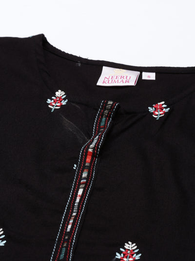 Neeru's Black Floral Print And Embroidered Using With Thread Work Straight Regular Kurtas.