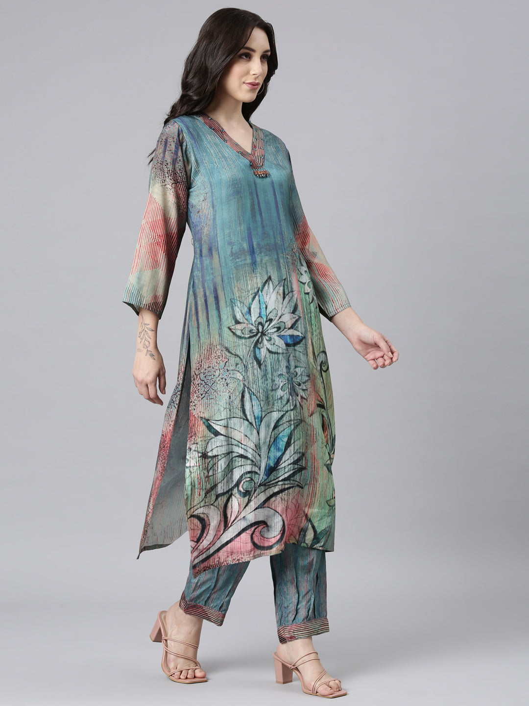 Neerus Blue Panelled Straight Kurta and Trousers A trendy and elegant set that will make you stand out at any event.