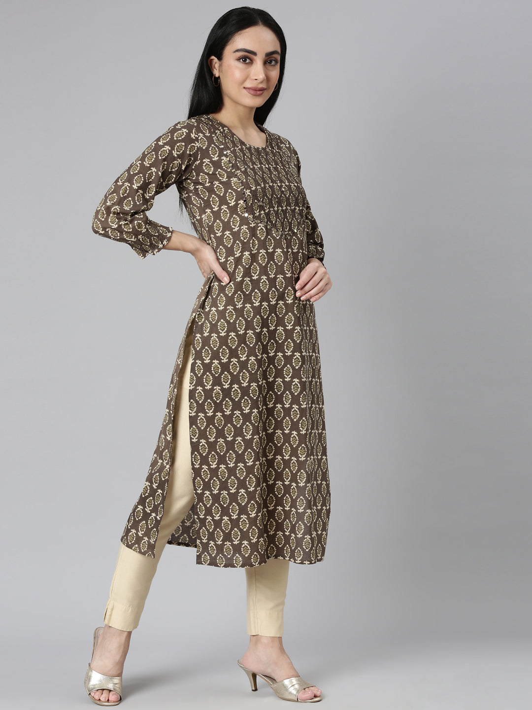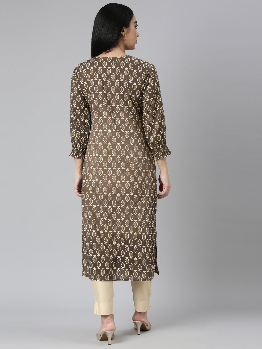 Neerus Brown Straight Casual Floral Straight Kurtas