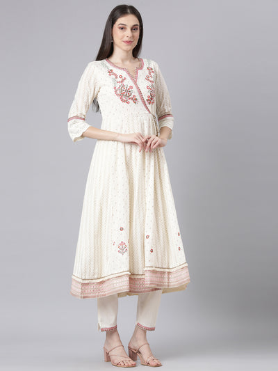 Neerus Cream Embroidered Anarkali Kurta and Trousers With Dupatta