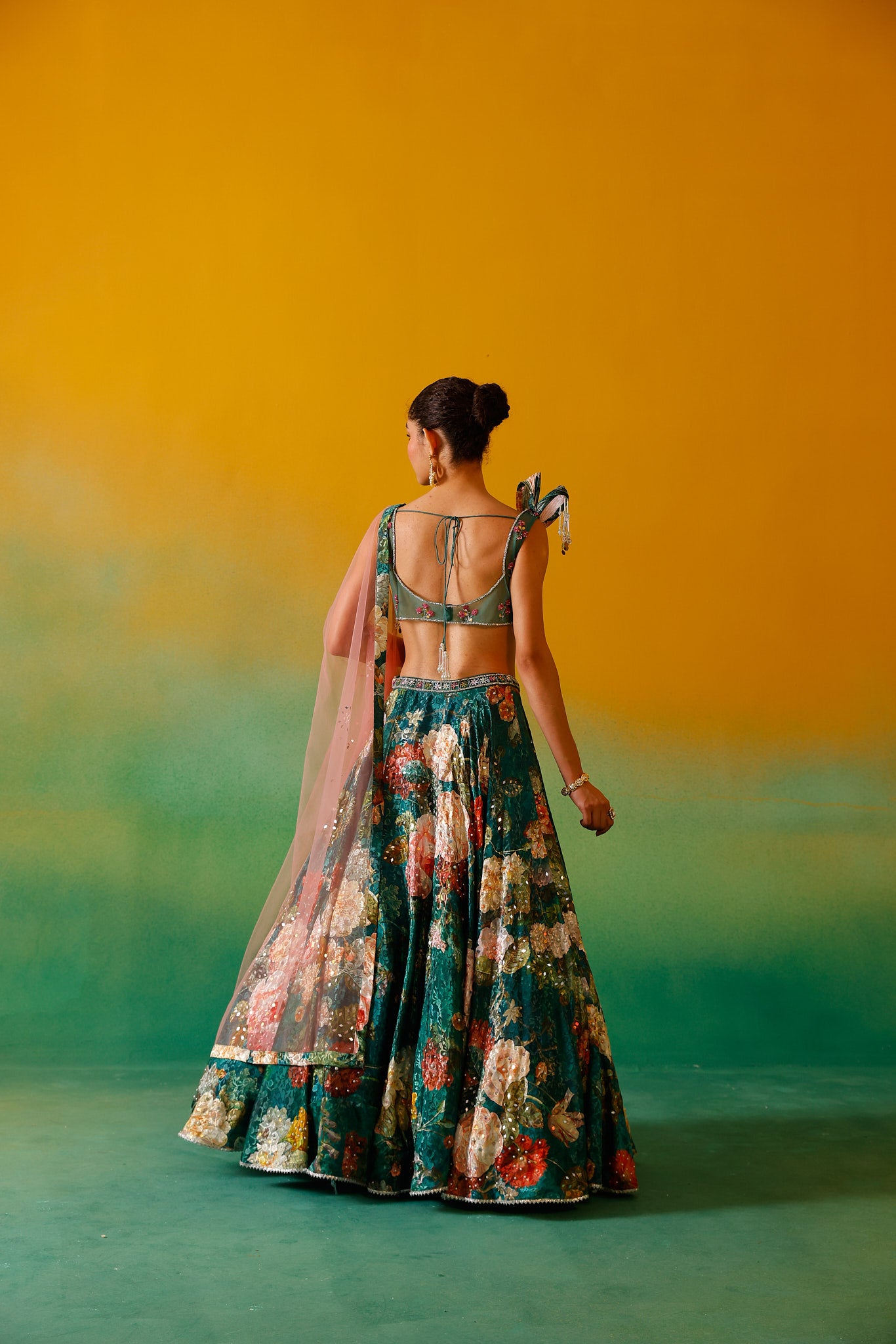 Neerus Bottle Green Embroidery work Satin Fabric Ghagra Set This elegant set is made with high-quality satin fabric and features intricate embroidery work. It's perfect for special occasions and will make you stand out in a crowd.