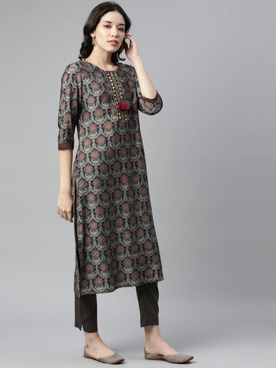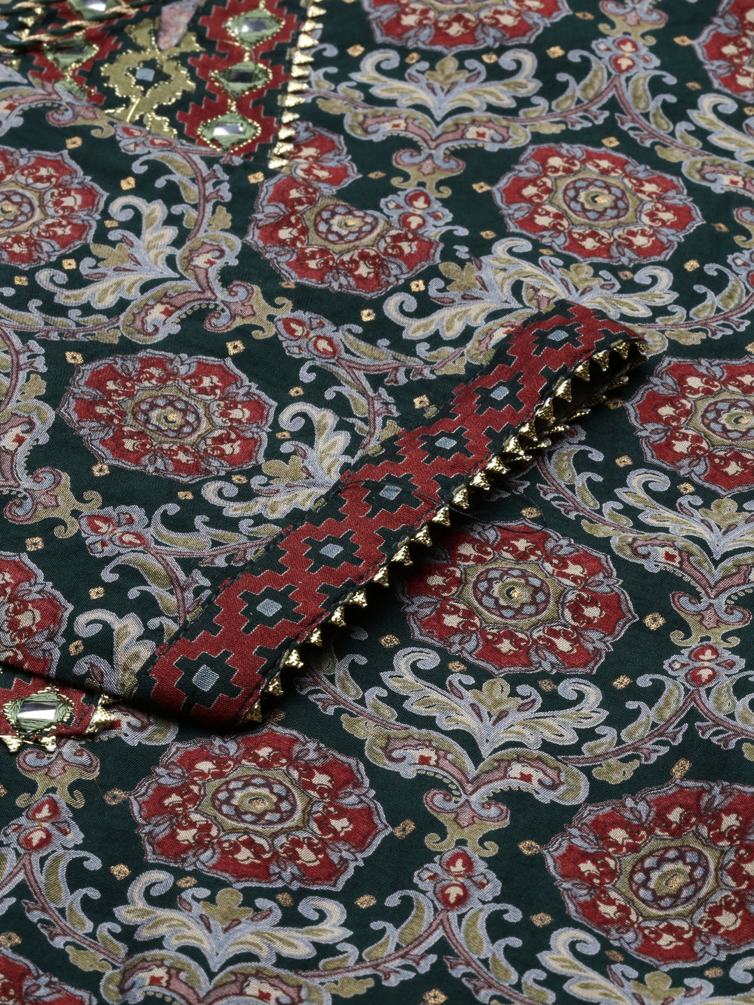 Neeru's Green Ethnic Motifs Printed Mirror Work Straight Regular Kurtas.