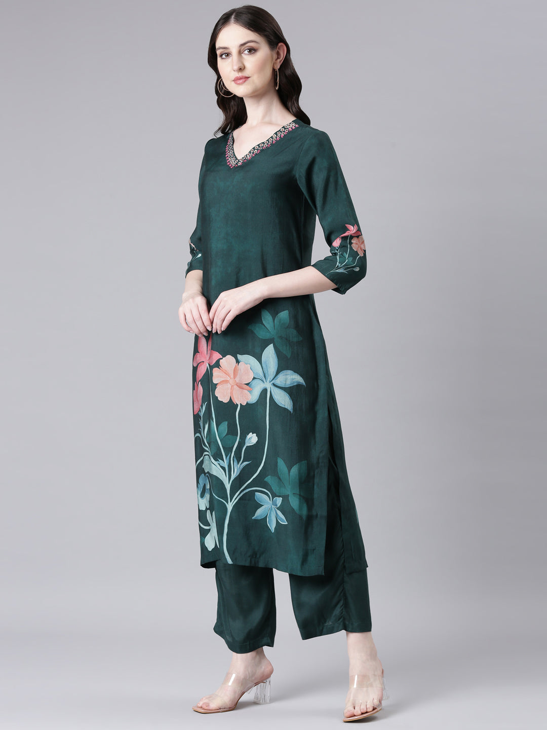 Perfect for any occasion, this kurta and trousers set will make you stand out with its vibrant green print.