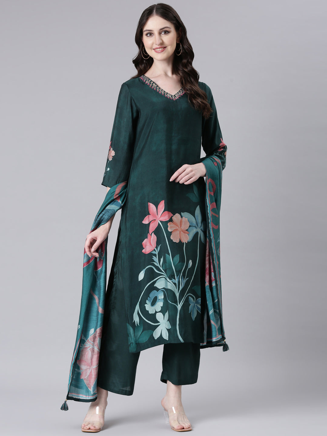 Neerus Green Printed Straight Kurta and Trousers With Dupatta
