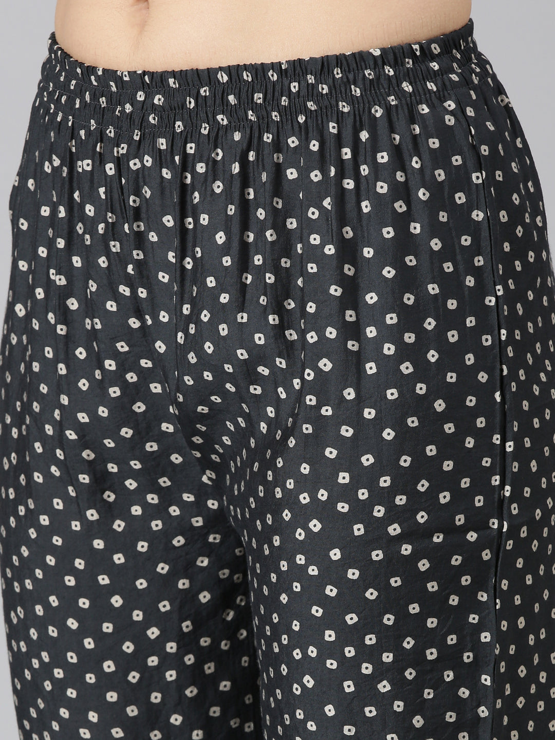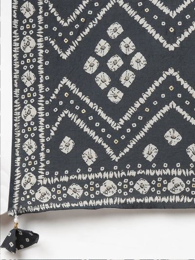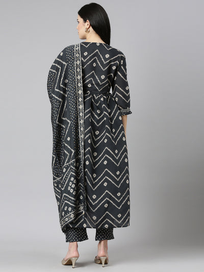 Neerus Grey Pleated Straight Printed Kurta And Trousers With Dupatta