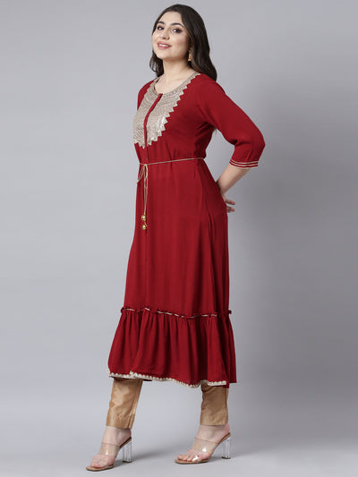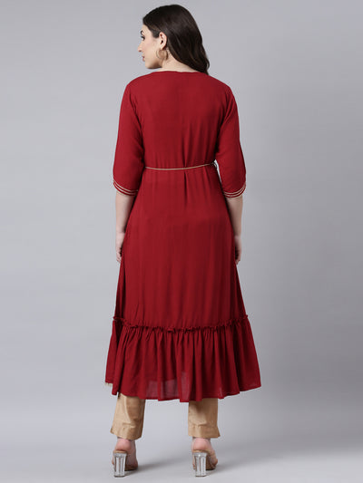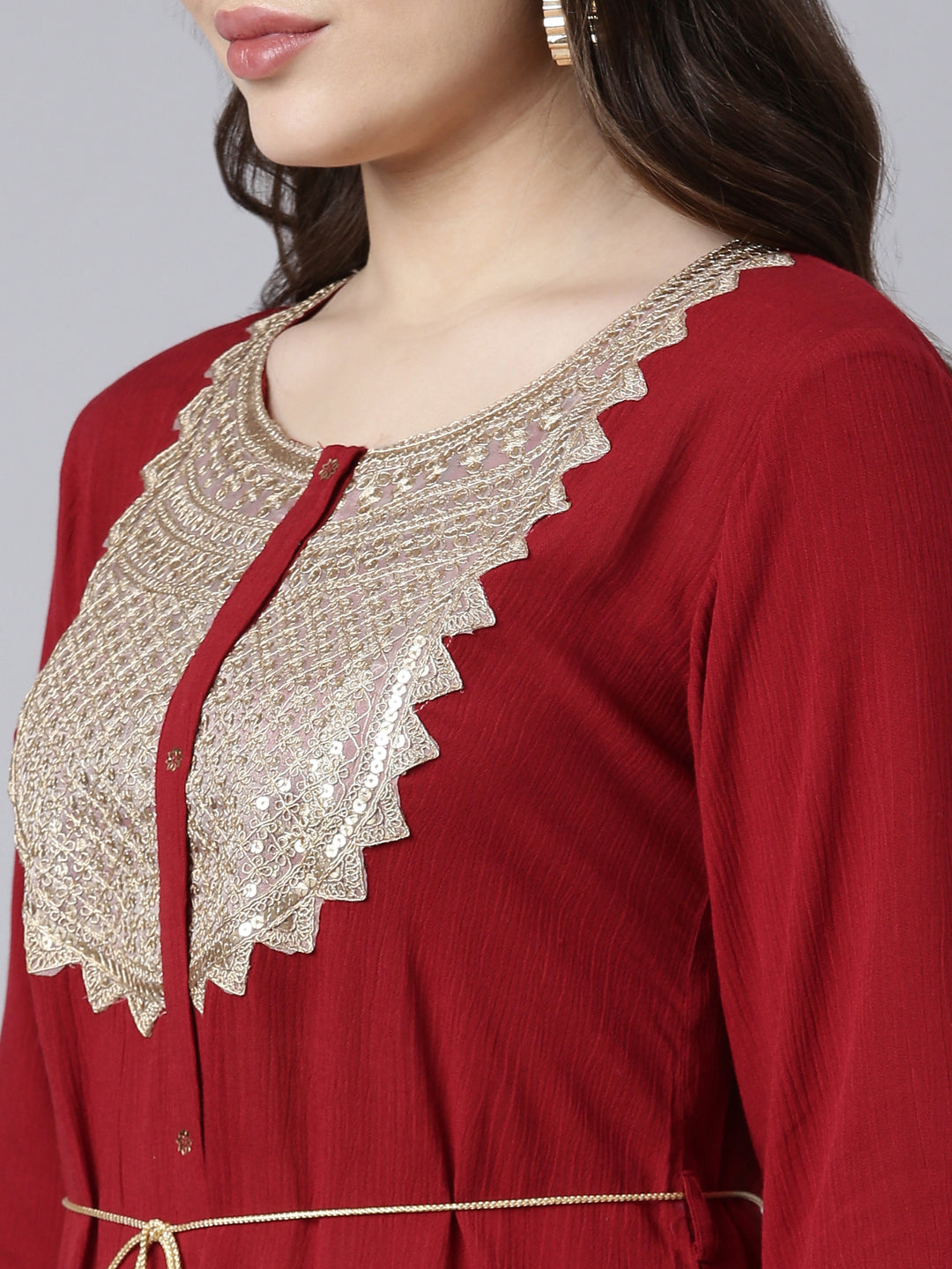 Neerus Maroon Straight Casual Solid Maxi Dresses