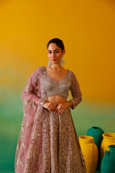 Neerus Mauve Embroidery work Nett Fabric Ghagra Set