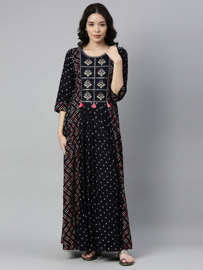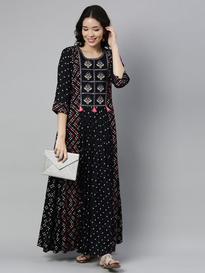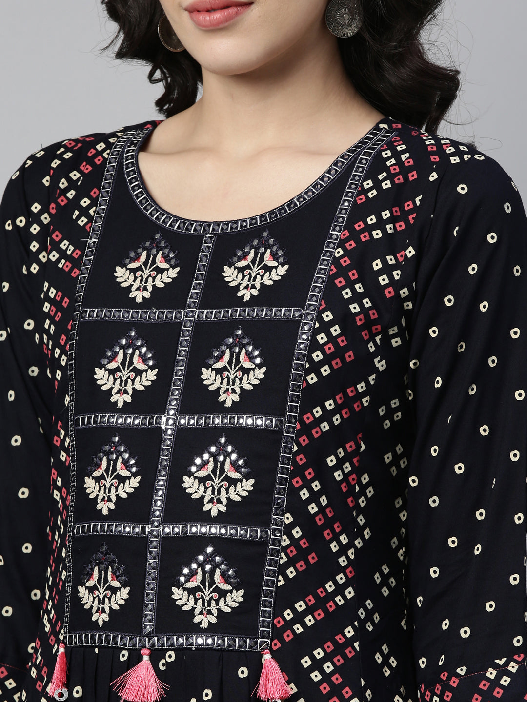 Neeru's Navy Blue Bandhani Print And Yoke Design With Mirror Work Anarkali Straight Kurtas.