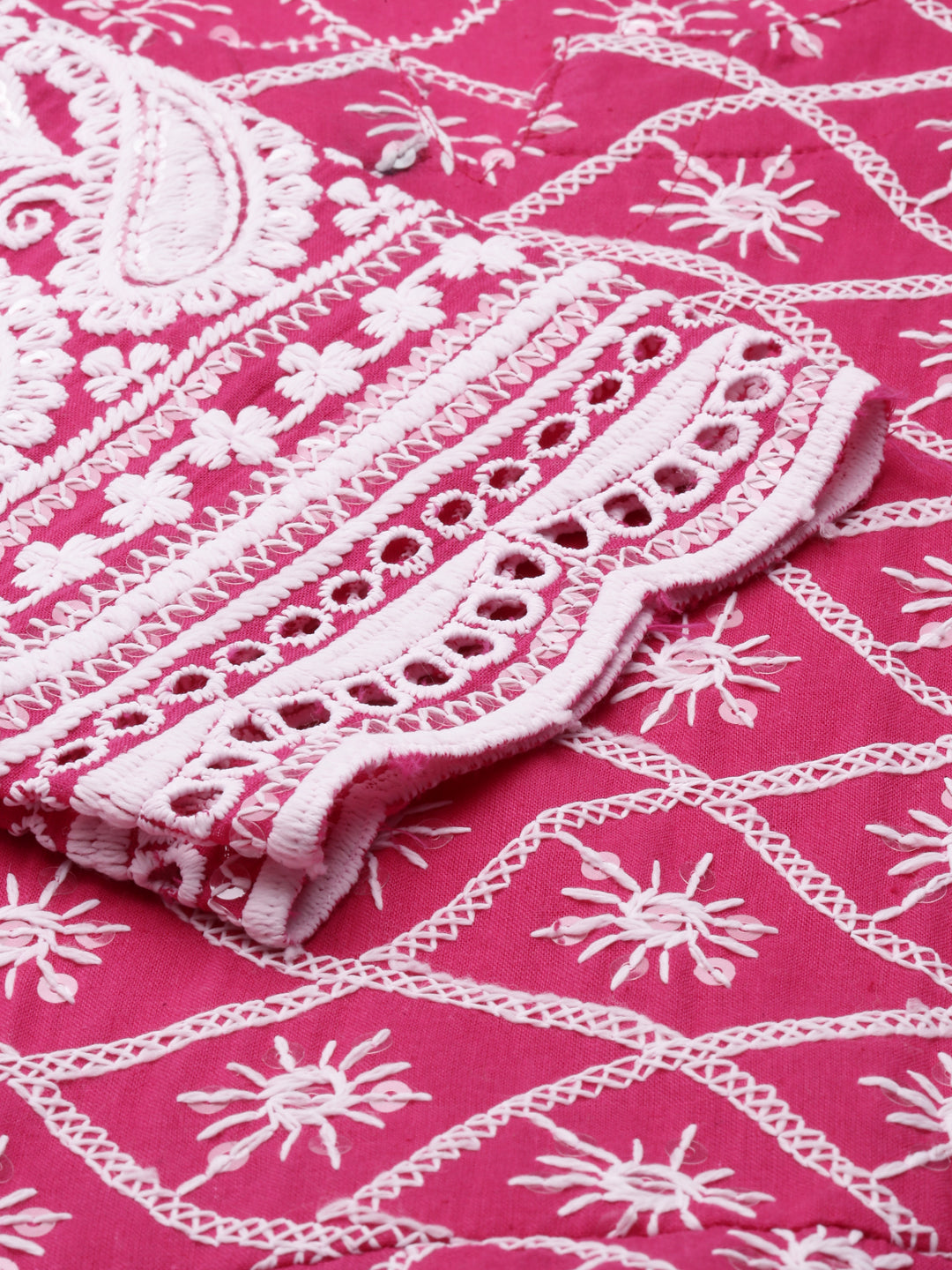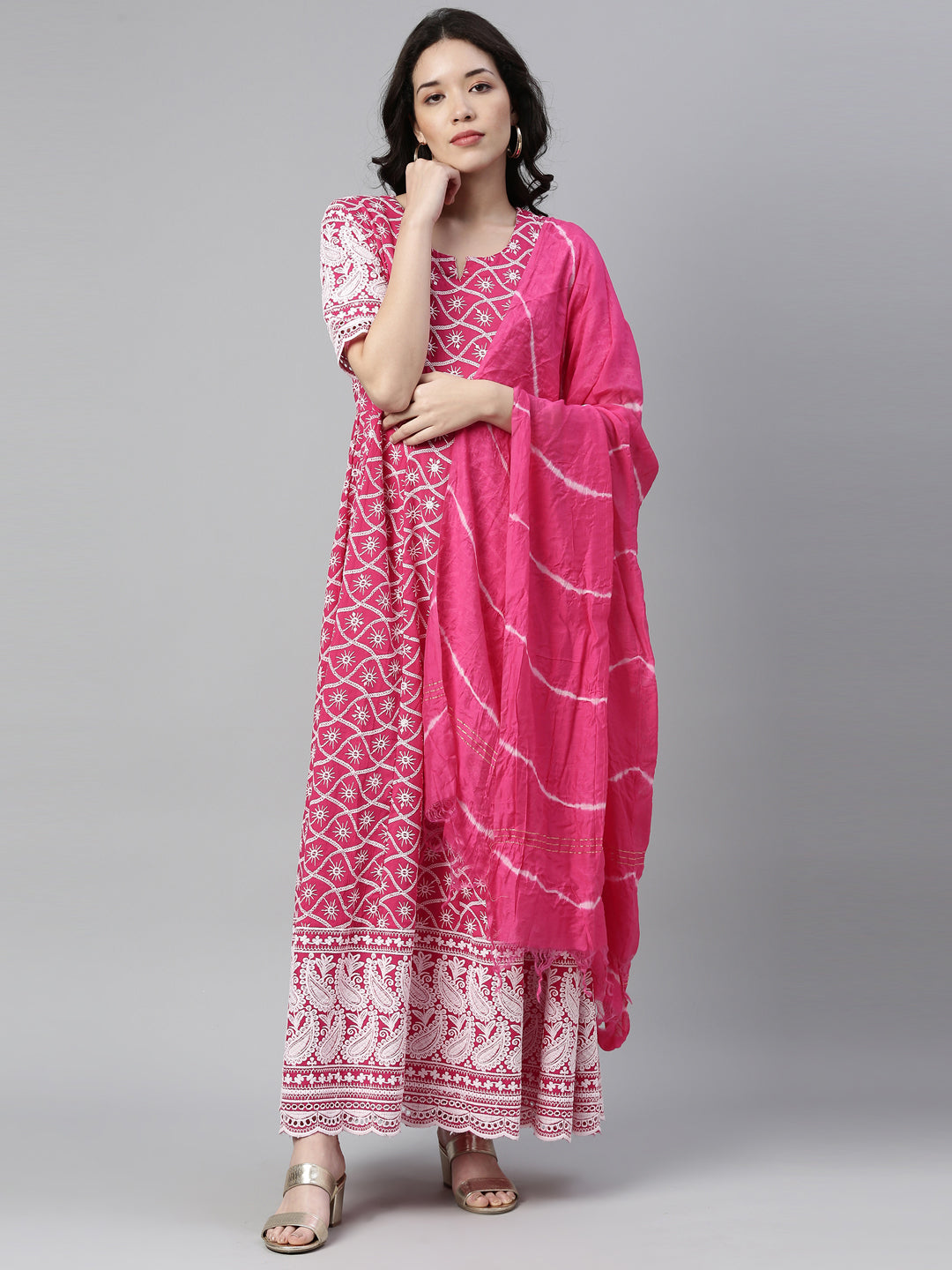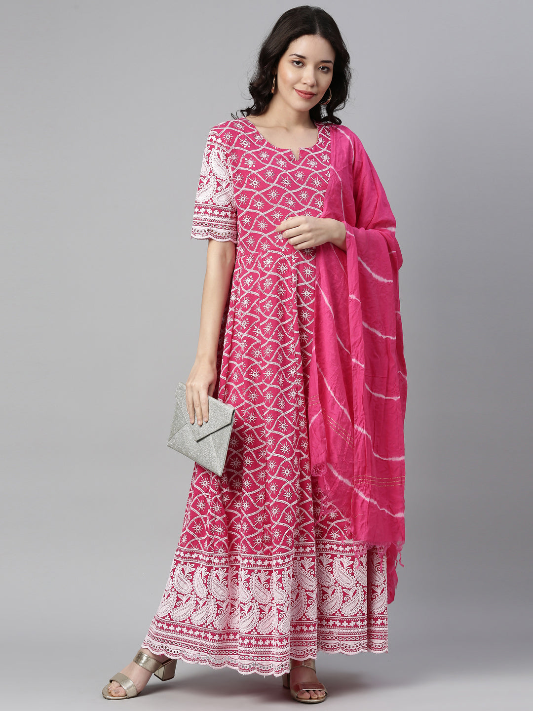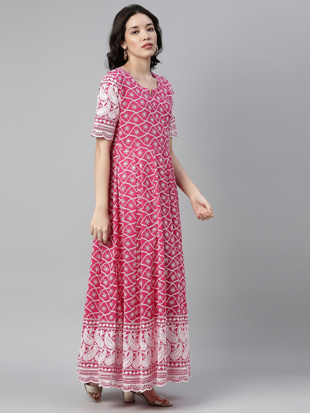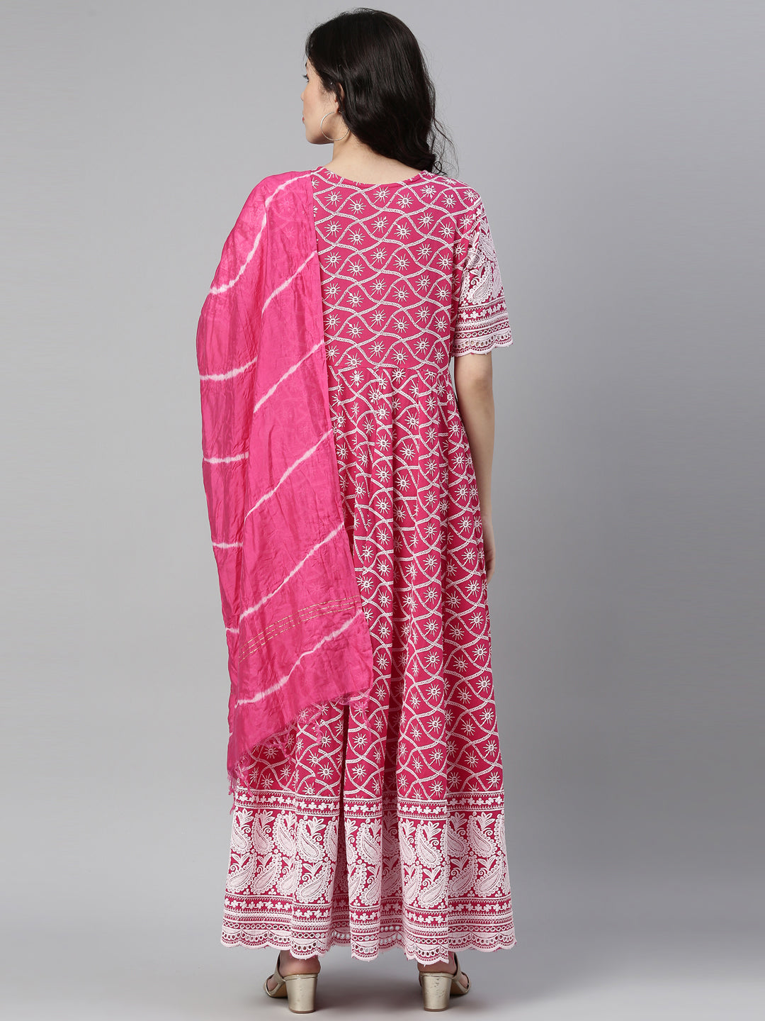 Neeru's Pink Floral Chikankari Embroidered Anarkali Regular Kurtas.