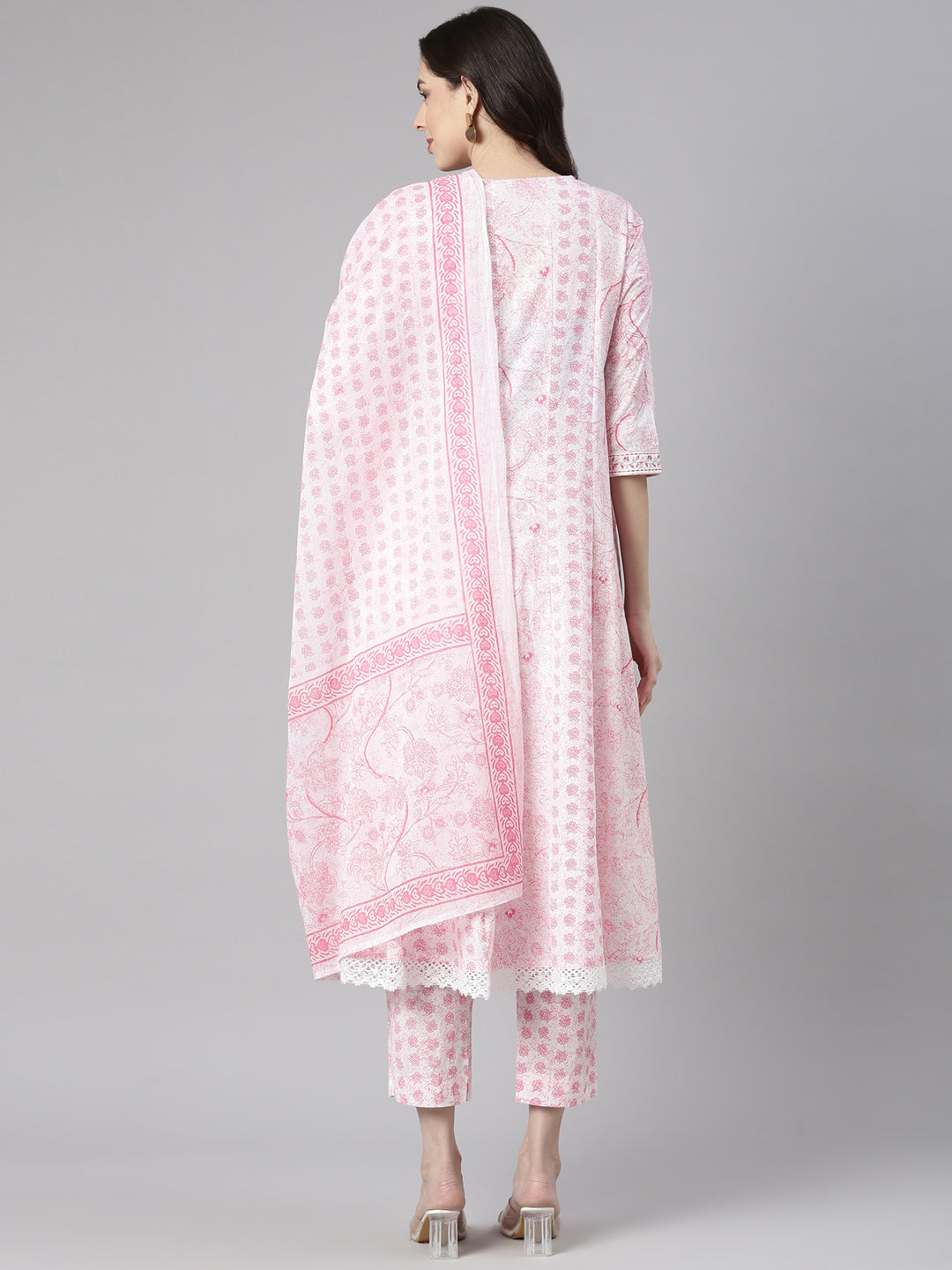 Neerus Pink Printed Anarkali Kurta and Trousers With Dupatta