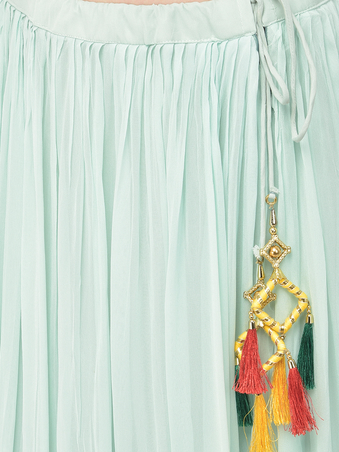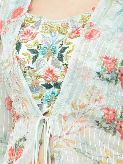 Neeru's Pista Green Fusion Set With All Over Embroidery Using With Cutdana, Zardosi And Theard Work Top Along Floral Print Over Coat.