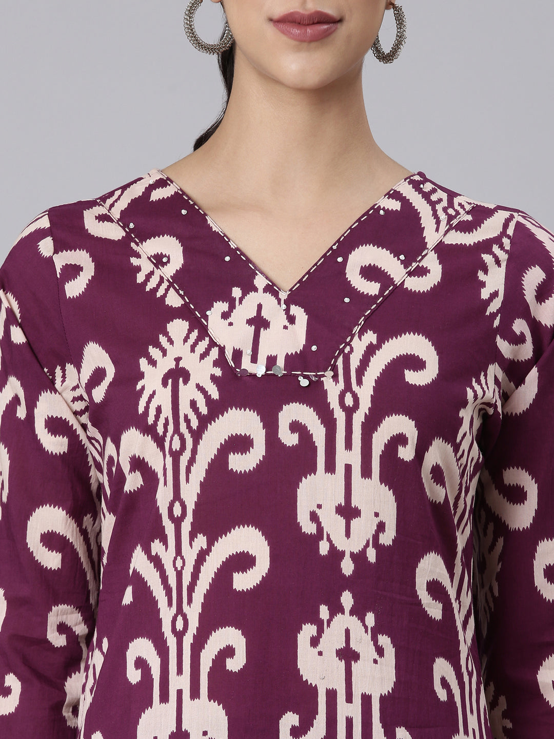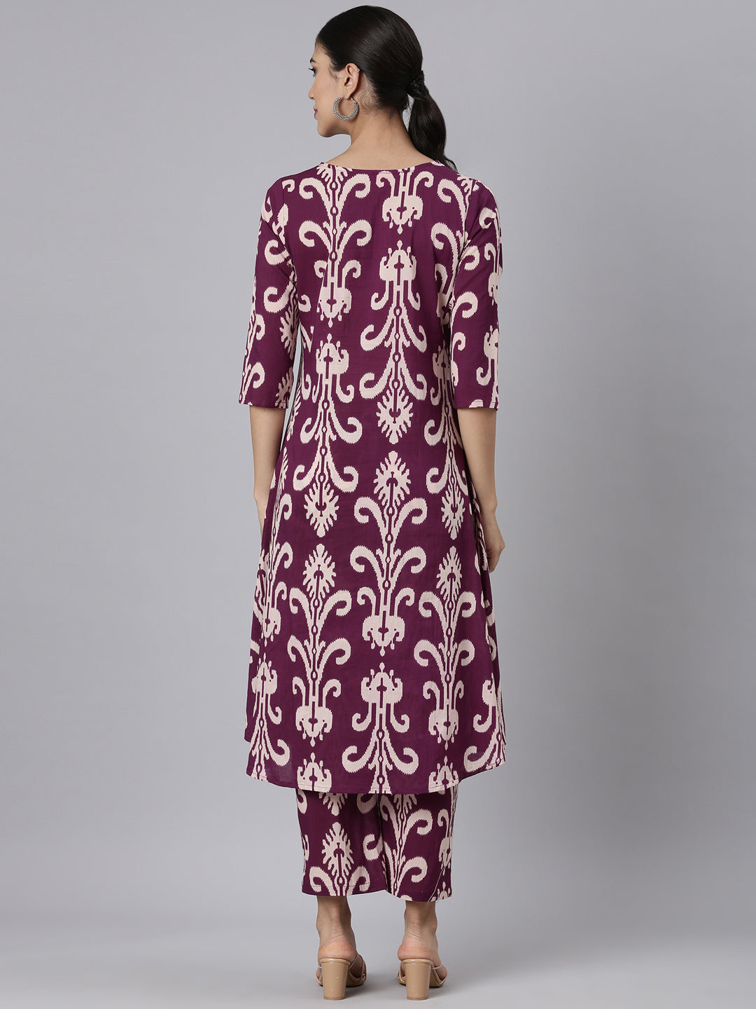 Neerus Purple Casual Printed Curved Kurta and Trousers