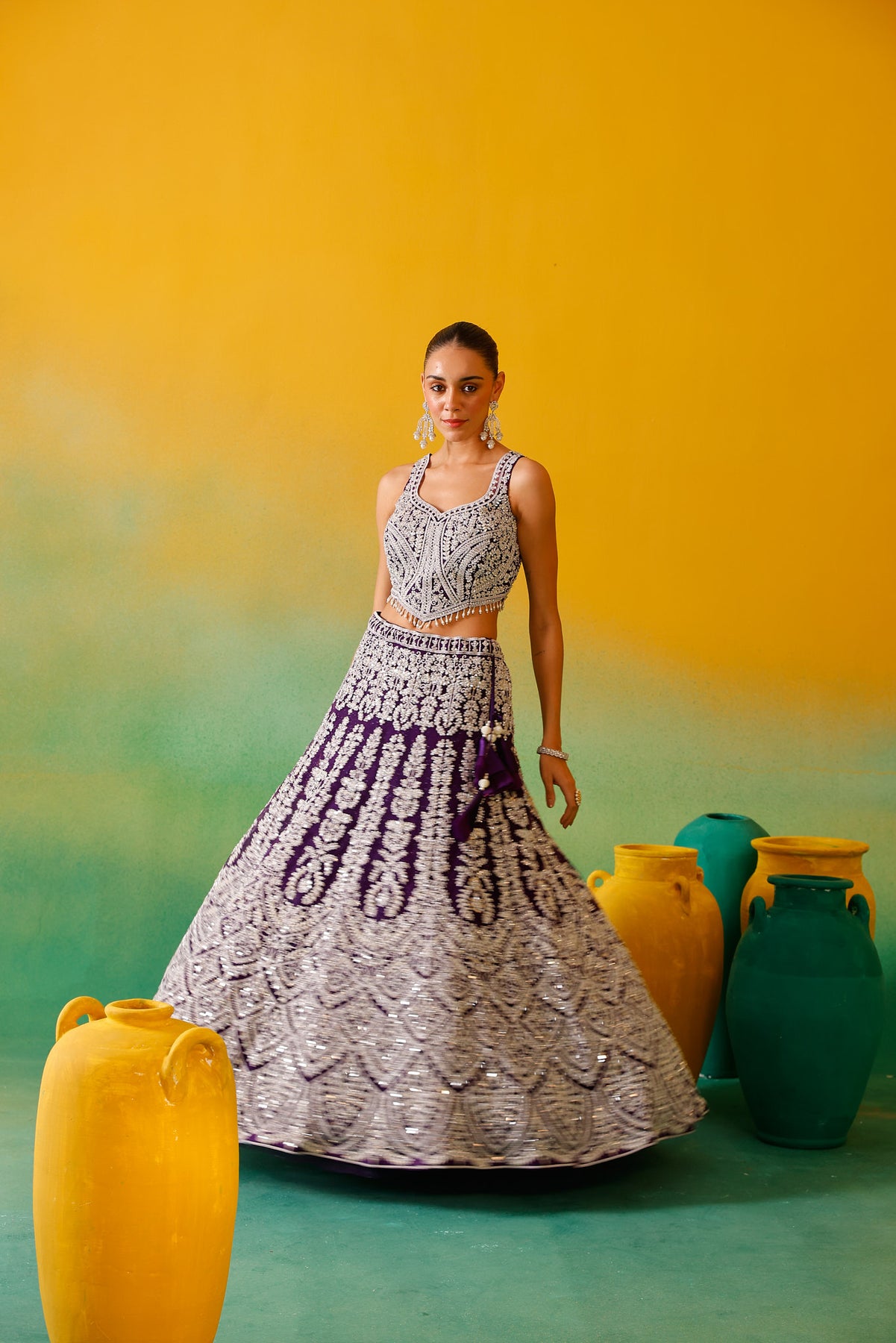 Neerus Purple Embroidery work Nett Fabric Ghagra Set Designed to make you shine! This outfit will captivate everyone with its intricate embroidery work and soft nett fabric. Get ready to turn heads at any special occasion!