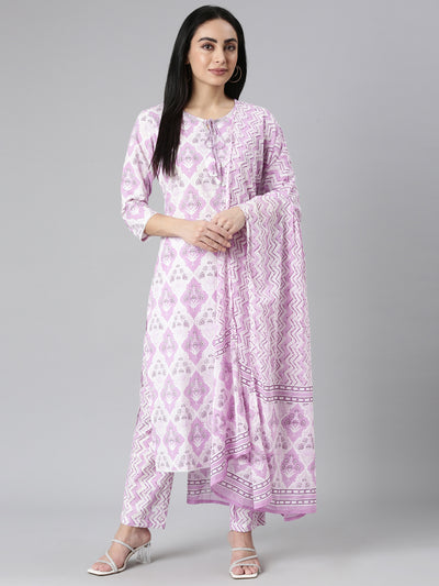 Neerus Purple Regular Straight Printed Kurta and Trousers With Dupatta Add a pop of color to your wardrobe with this stunning kurta, trouser, and dupatta set. Perfect for everyday wear, this outfit is both comfortable and versatile.