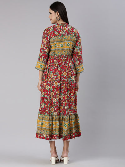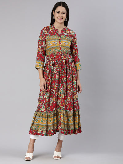 Neeru's Red Straight Casual Dress, Adorned With Floral Motifs, Exudes Class And Elegance.