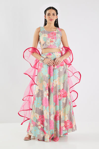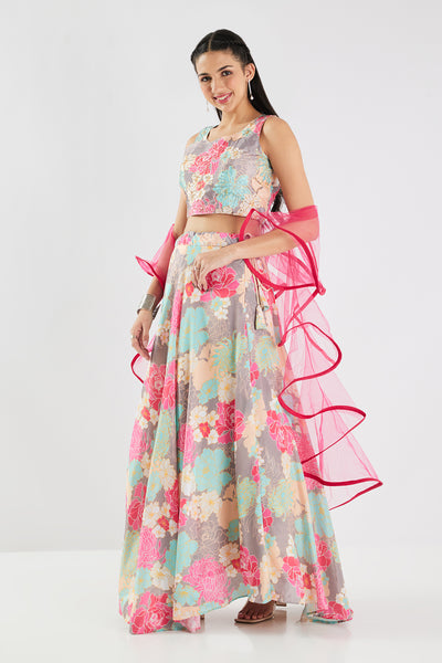 Luxurious and stunning, this ghagra set is perfect for any special occasion. Elevate your style with intricate beads and sequins work, all on soft and smooth silk fabric.