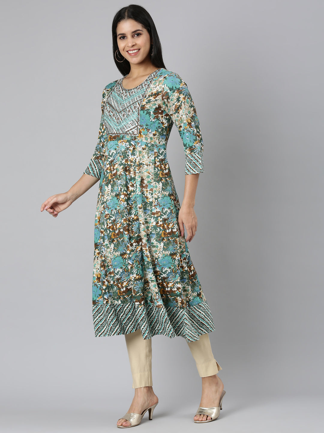 Neerus Sea Green Casual Floral Anarkali Kurtas