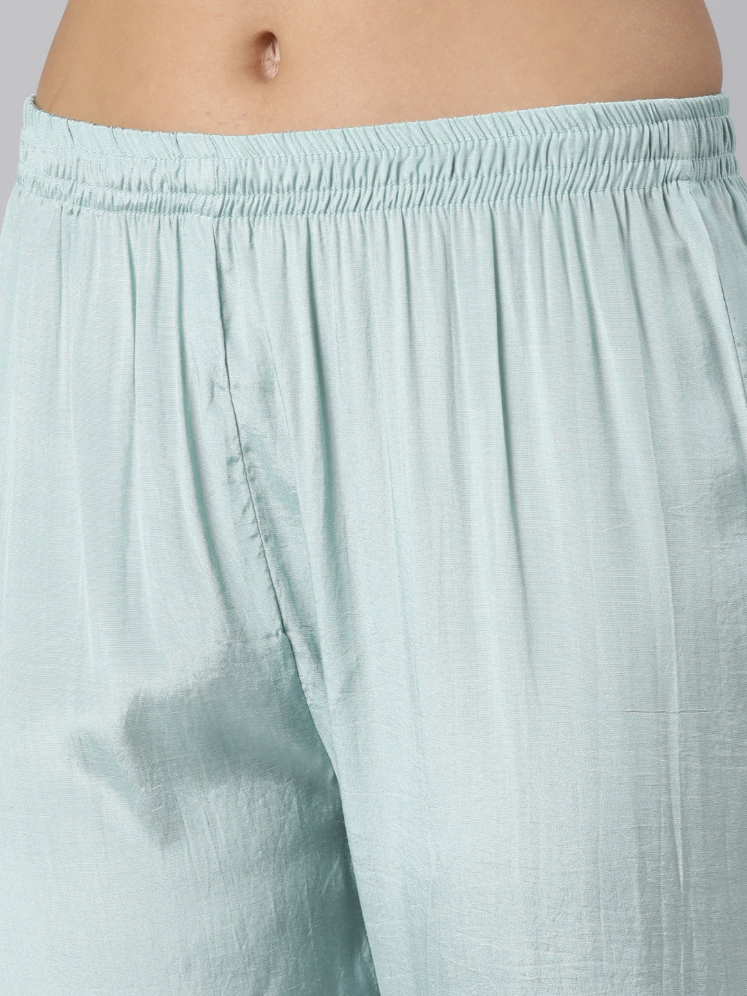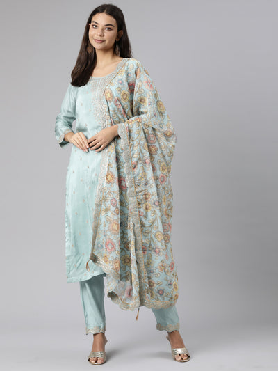 Neerus Sea Green Regular Straight Floral Kurta And Trousers With Dupatta