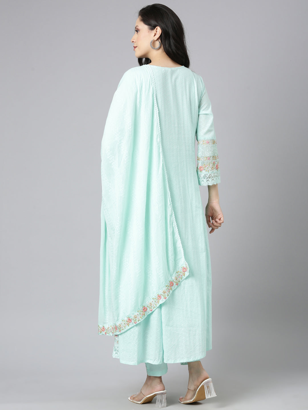 Elevate your ethnic wardrobe with the Neerus Sea Green Yoke Design Anarkali Kurta paired with matching trousers and a coordinating dupatta. Crafted for a graceful silhouette, the Anarkali features intricate yoke detailing that adds refined elegance.