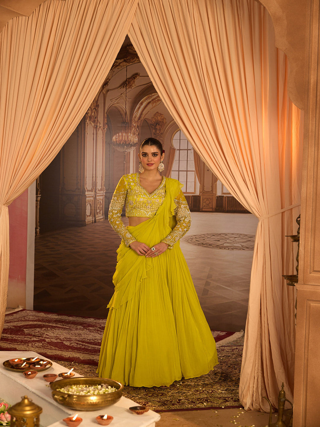 Neerus Variyali Green Embroidery Work Georgette Fabric Ghagra Set Beautifully crafted with intricate embroidery work, this ghagra set is sure to turn heads wherever you go.