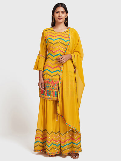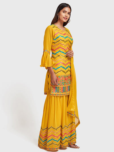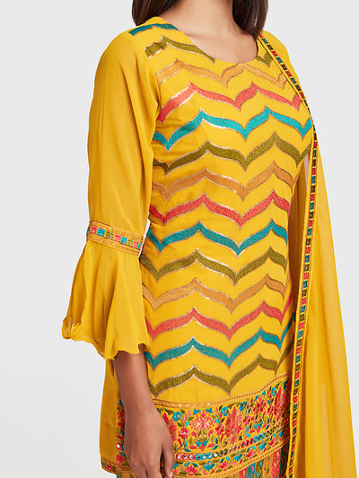 Neerus Yellow Embellished Kurta With Sharara & Dupatta