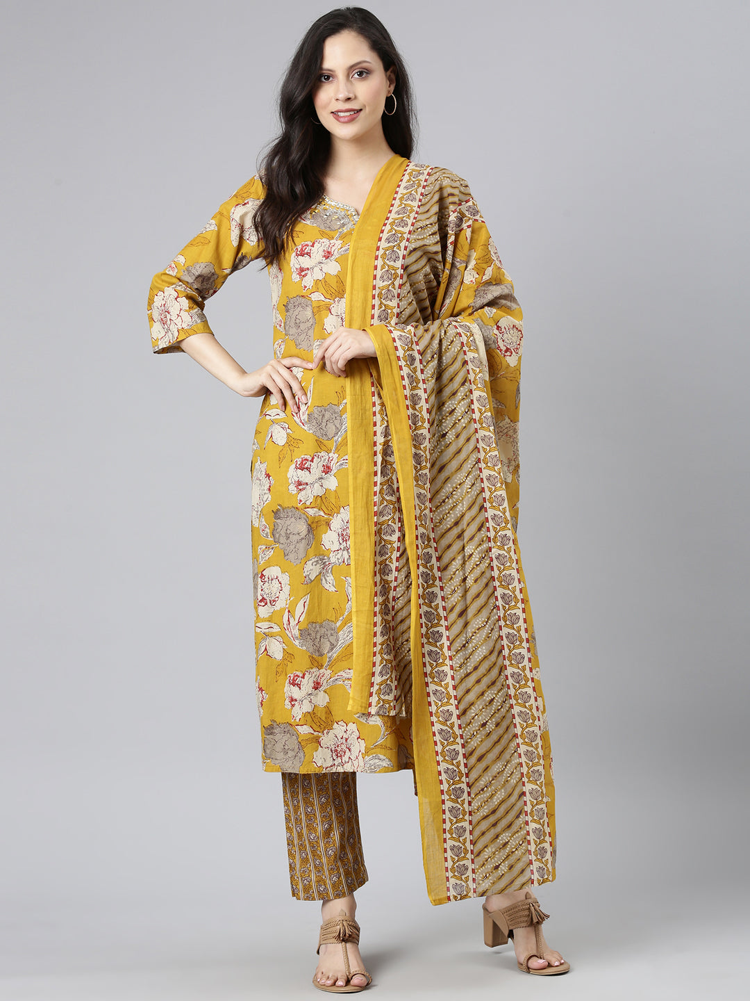 Elevate your ethnic wardrobe with the Neerus Yellow Printed Straight Kurta and Trousers set, complemented by a matching dupatta. Crafted for a flattering straight fit, this ensemble combines vibrant yellow prints with comfortable tailoring, ensuring ease of movement and style.