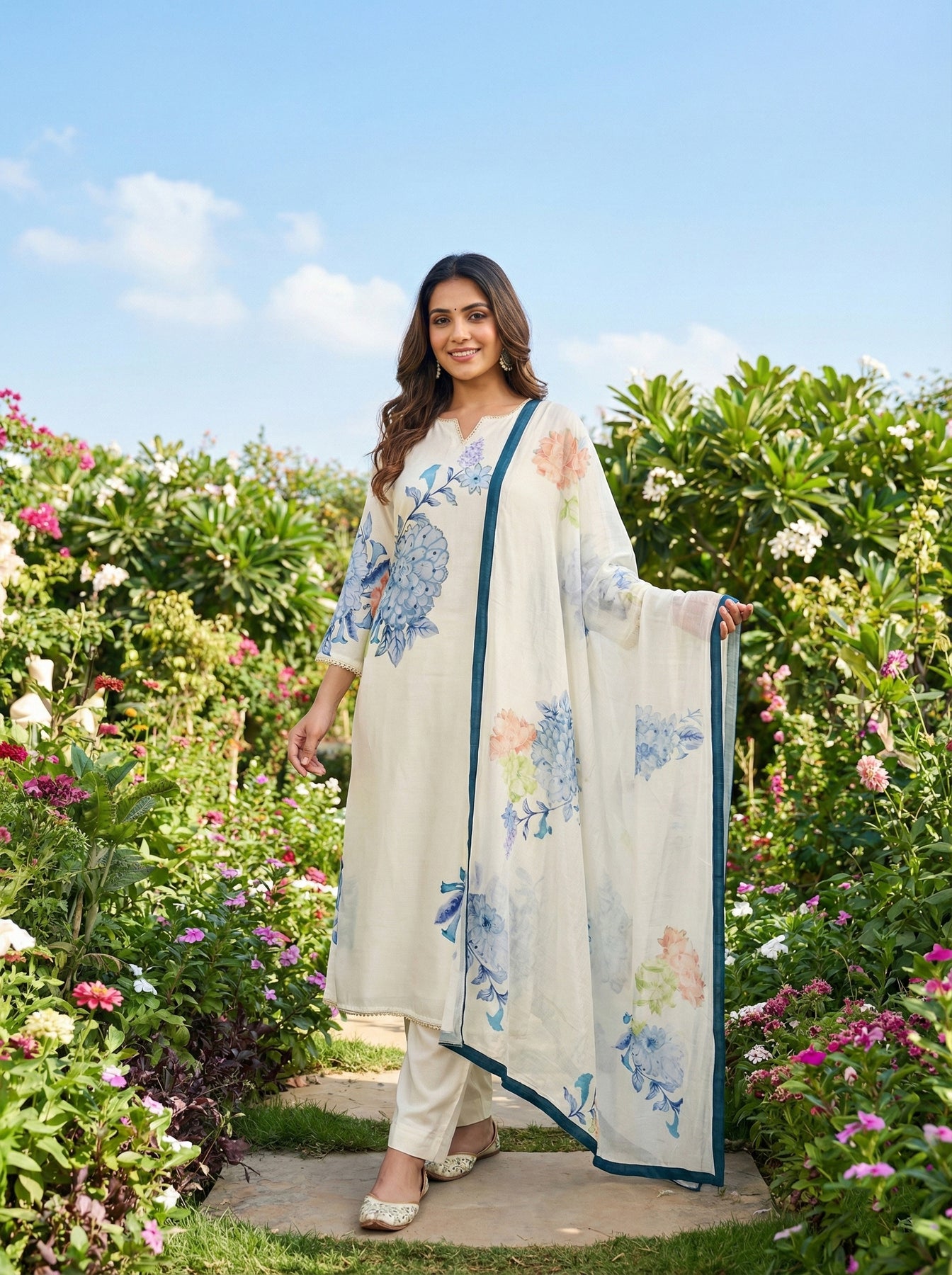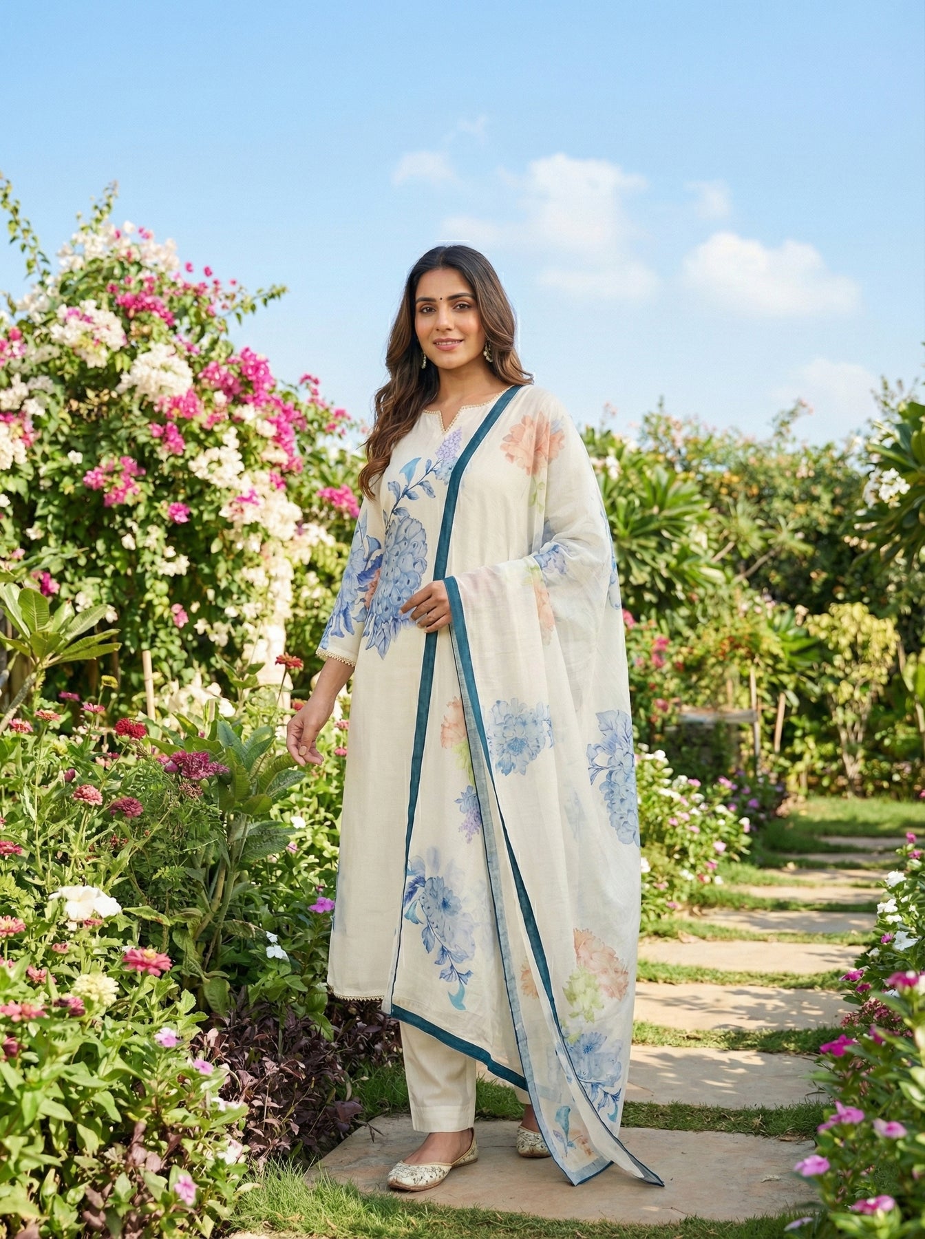 Embrace effortless elegance with this charming three-piece set crafted from soft muslin fabric. The delicate floral print in warm off-white tones brings a timeless, versatile appeal perfect for any occasion. Each piece is thoughtfully designed to mix and match, giving you multiple styling options from a single collection. The breathable muslin ensures comfort throughout the day, while the classic floral pattern adds a touch of understated sophistication. Ideal for those who appreciate quality craftsmanship and graceful, wearable style.